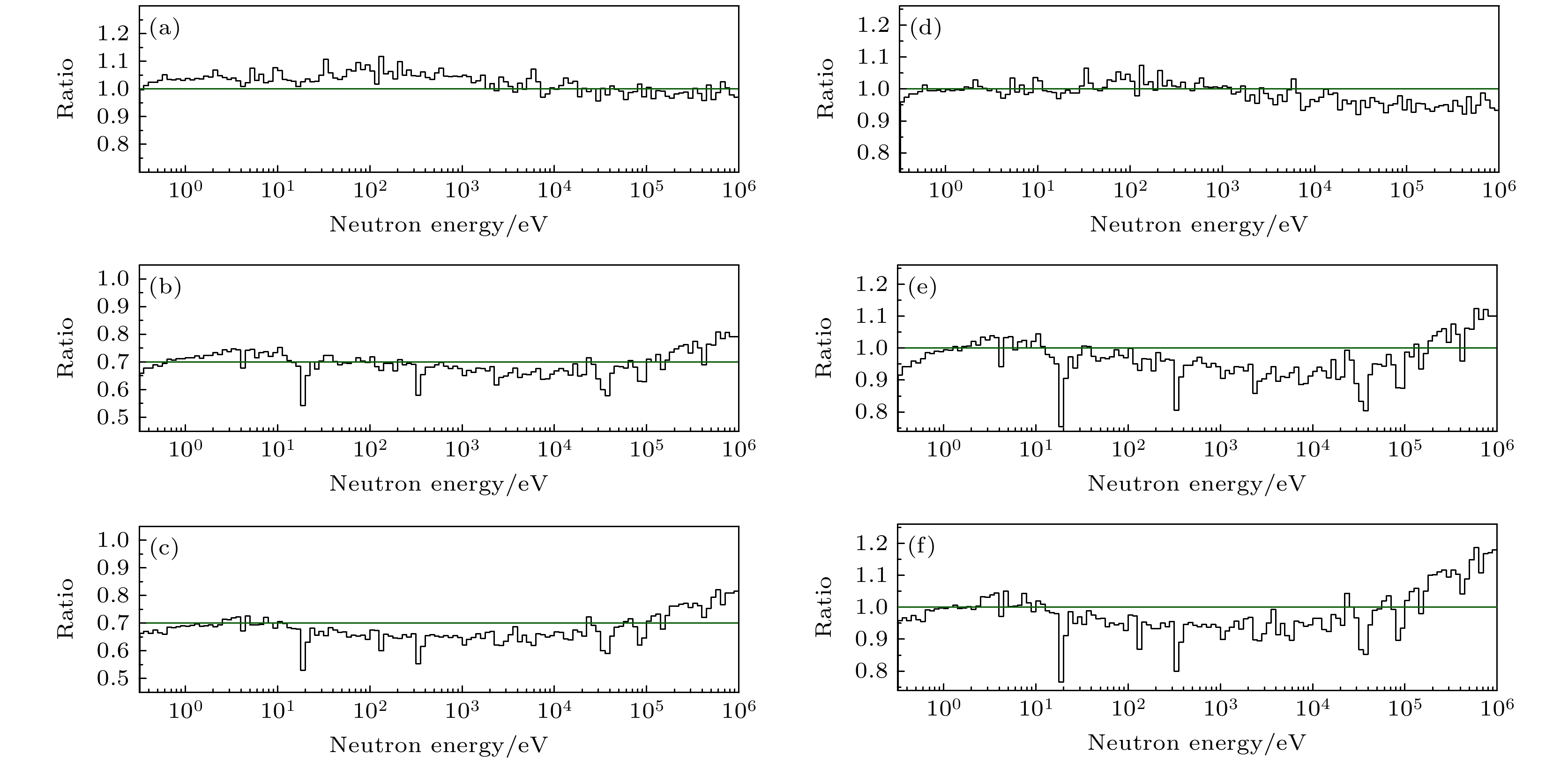 Fig. 10.  (a)–(c) Comparison of relative flux for the 50-15-40 collimator in recent three years. (d)–(f) Shape comparison of 50-15-40 collimator after normalizing by 1–2 eV area. (a) 2025/2024; (b) 2025/2022; (c) 2024/2022; (d) 2025/2024; (e) 2025/2022; (f) 2024/2022.