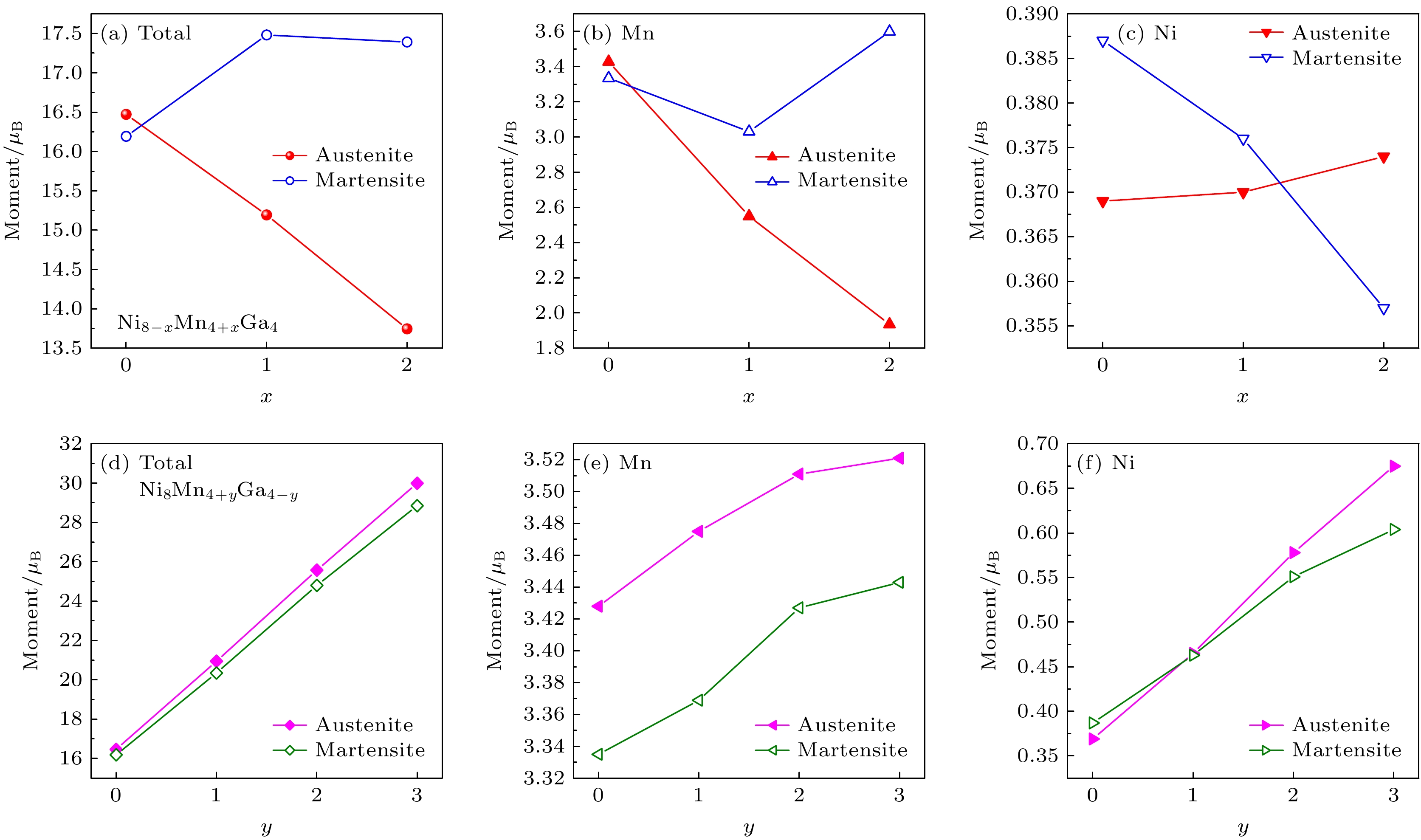 图 2 奥氏体相和马氏体相Ni8–xMn4+xGa4(x = 0, 1, 2)和Ni8Mn4+yGa4–y(y = 0, 1, 2, 3)合金总磁矩和Mn, Ni原子磁矩随成分的变化趋势