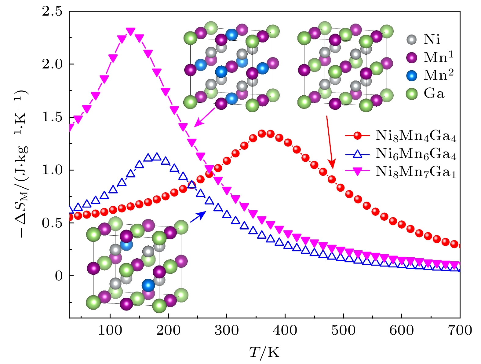 本文基于磁热效应的绿色磁制冷技术, 并以Ni-Mn-Ga Heusler合金为对象, 系统地探索其作为磁制冷工质的潜力. 为阐明富Mn成分对合金磁性与磁热性能的调控机制, 采用第一性原理计算与蒙特卡罗模拟相结合的多尺度方法, 重点分析Mn原子分别占据Ni与Ga位时, 对合金微观结构、原子磁矩、交换作用及宏观磁热行为的影响. 结果表明, Mn占位方式对磁性能具有关键调控作用: Mn占据Ni位会降低总磁矩与居里温度, 并减小磁熵变; 而Mn占据Ga位则显著提升总磁矩与磁熵变, 其中Ni8Mn7Ga1合金在2 T磁场下的最大磁熵变高达2.32 J·kg–1·K–1, 远高于化学计量比Ni8Mn4Ga4合金. 态密度与交换作用分析进一步表明, Mn含量变化可调控其在费米能级附近的电子结构, 优化轨道杂化与铁磁交换作用, 影响磁相变行为. 临界指数分析显示合金中磁相互作用具有长程特性, 并随成分变化趋近于平均场行为. 本工作从微观层面建立了“成分-结构-磁性-磁热性能”之间的构效关系, 为设计高性能、低滞后磁制冷材料提供了理论依据.