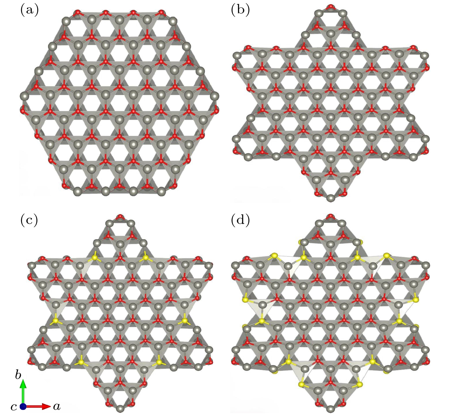 图 1 4种纳米线结构 (a) 六边形氧化锌纳米线结构; (b) 六角星形氧化锌纳米线结构; (c) 12个硫掺杂的六角星形纳米线结构(ZnSO); (d) 24个硫掺杂的六角星形纳米线结构(ZnSSO); 其中红球代表O原子, 灰球代表Zn原子, 黄球代表S原子