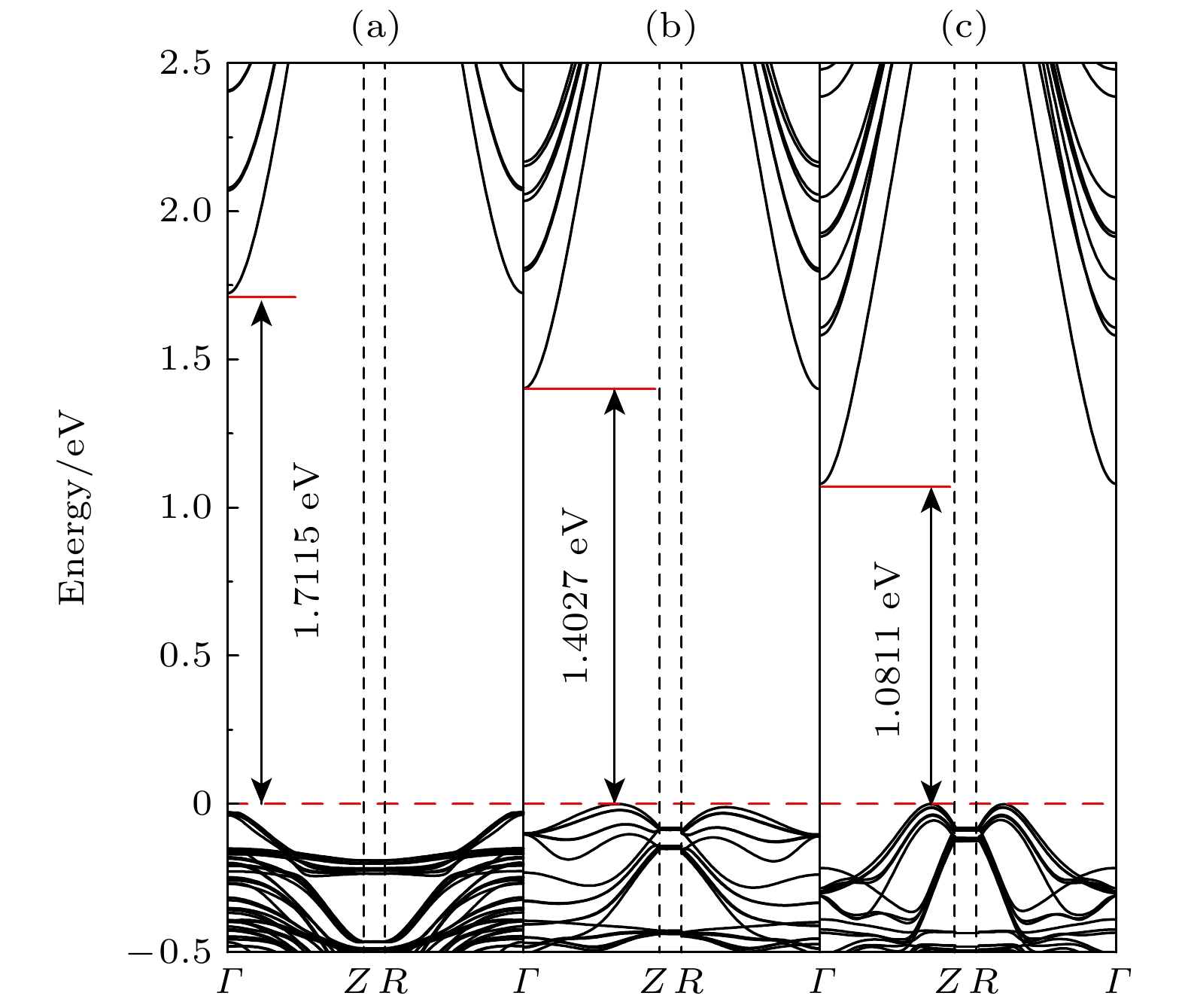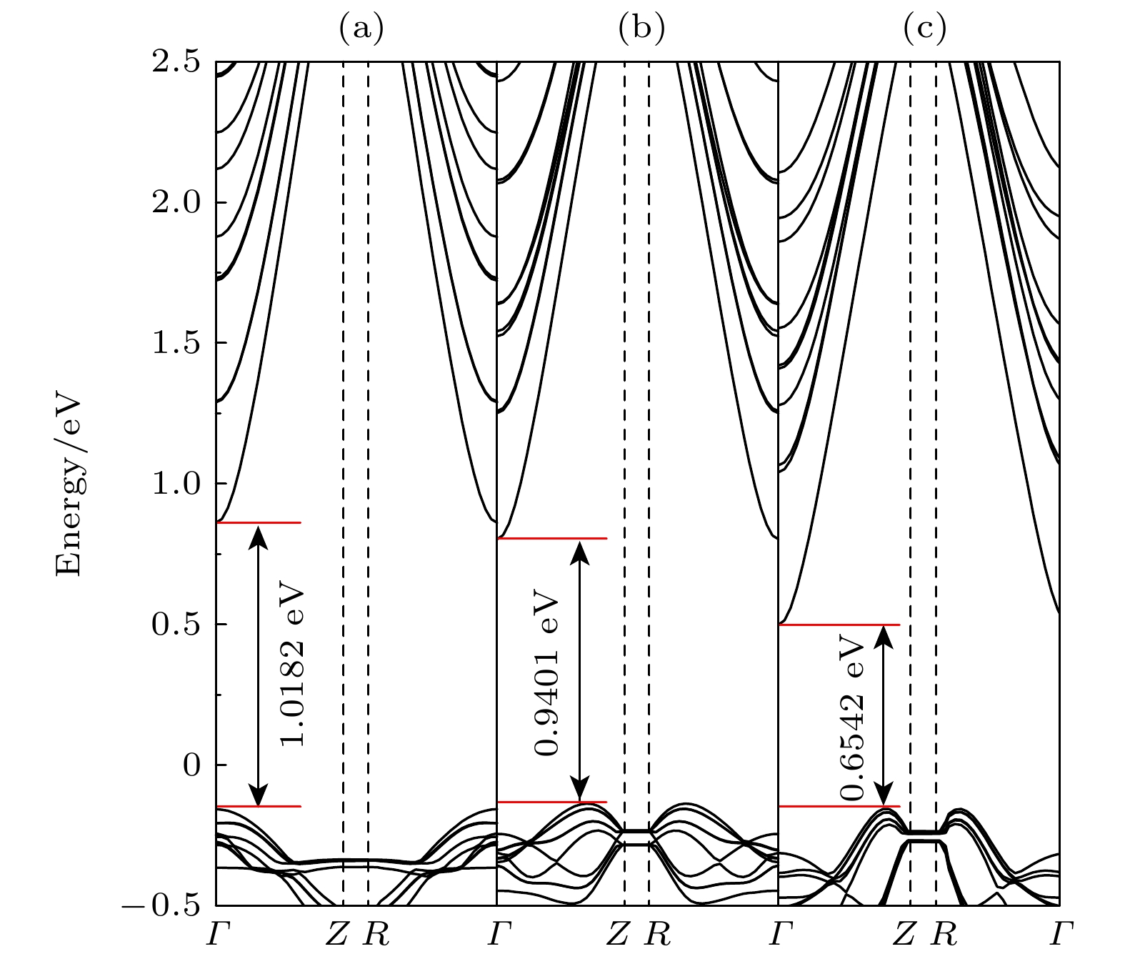 图 3 能带结构 (a) 六角星形氧化锌纳米线能带结构; (b) 12个硫掺杂的六角星形氧化锌纳米线结构(ZnSO); (c) 24个硫掺杂的六角星形氧化锌纳米线结构(ZnSSO); 高对称点Γ, Z, R对应的布里渊区位置分别为Γ (0, 0, 0), Z (0, 0, 0.5), R (0.5, 0.5, 0.5); s纳米线的轴向方向为(0001)