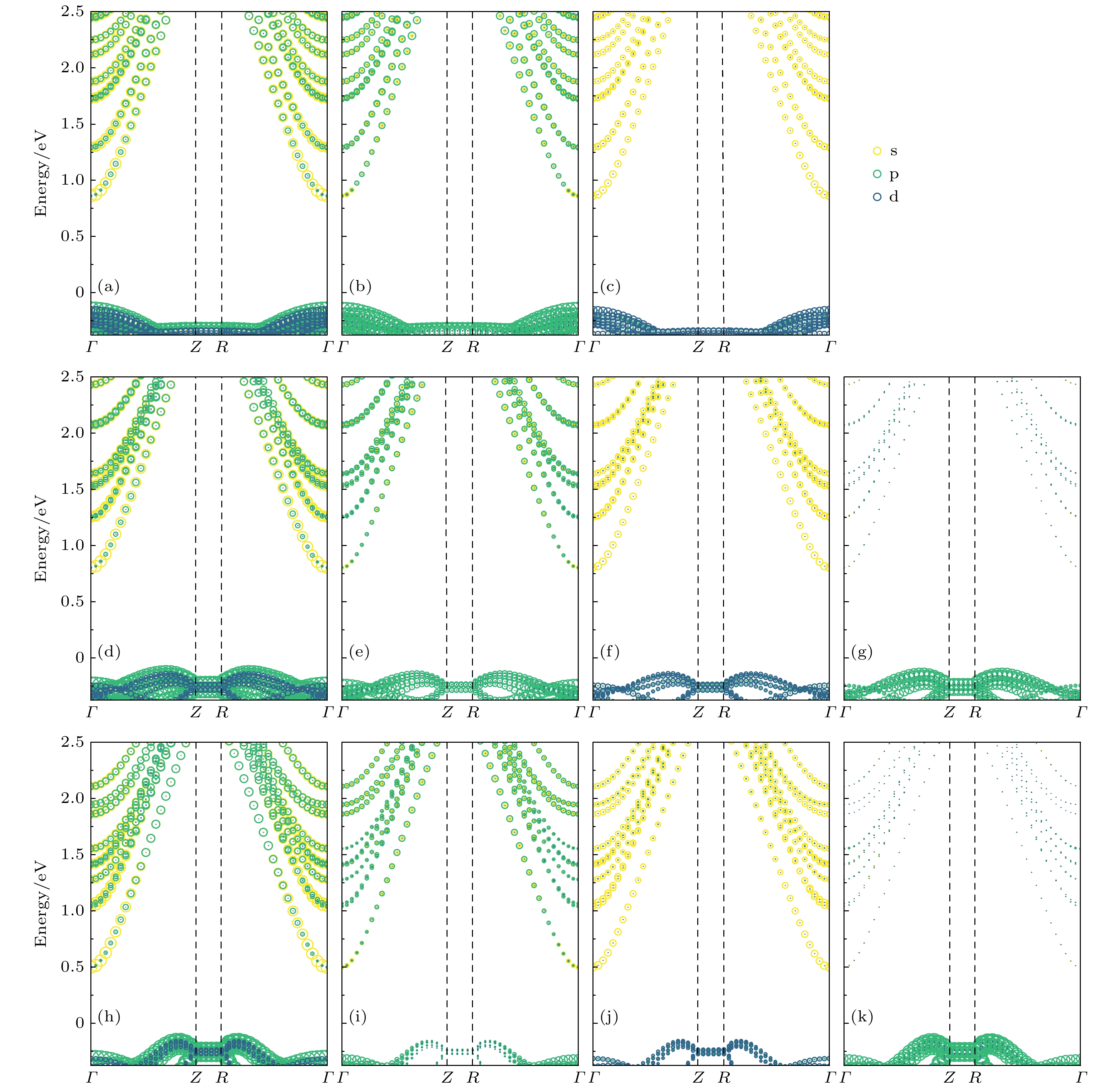 图 5 六角星形ZnO纳米线的原子轨道投影能带结构, 其中(a)为总的, (b)为O原子, (c)为Zn原子; 六角星形ZnSO纳米线的原子轨道投影能带结构, 其中(d)为总的, (e)为O原子, (f)为Zn原子, (g)为S原子; 六角星形ZnSSO纳米线的原子轨道投影能带结构, 其中(h)为总的, (i)为O原子, (j)为Zn原子, (k)为S原子. 高对称点Γ, Z, R对应的布里渊区位置分别为 Γ (0, 0, 0), Z (0, 0, 0.5), R (0.5, 0.5, 0.5); 纳米线的轴向方向为(0001)