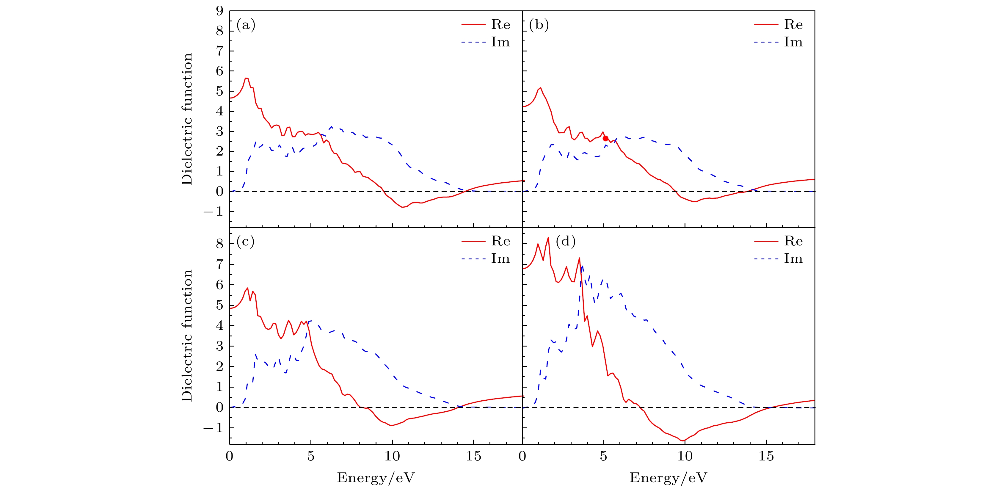图 6 介电函数(实部和虚部) (a) 六边形氧化锌纳米线; (b) 六角星形氧化锌纳米线; (c) 12个硫掺杂的六角星形纳米线(ZnSO); (d) 24个硫掺杂的六角星形纳米线(ZnSSO)