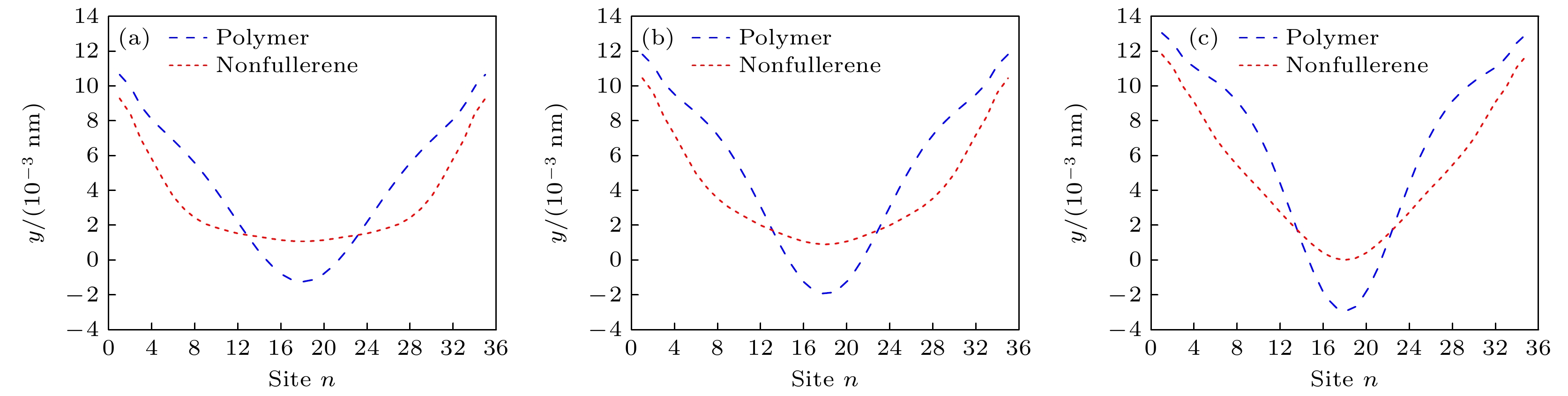 图 2 不同电子-晶格相互作用常数时, 聚合物和非富勒烯分子激发态的晶格位形 (a) $ \alpha {\text{ = 3}}{\text{.9 eV/{\AA}}} $; (b) $ \alpha {\text{ = 4}}{\text{.1 eV/{\AA} }} $; (c) $ \alpha {\text{ = 4}}{\text{.3 eV/{\AA} }} $