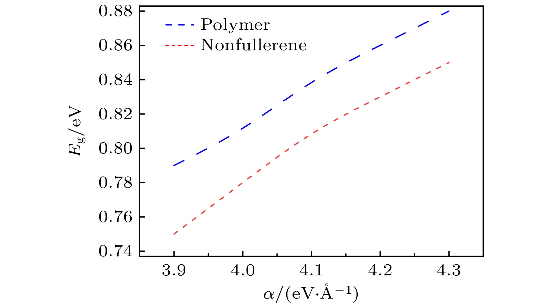 有机半导体材料的高激子束缚能限制了电荷分离效率, 研究聚合物给体和非富勒烯受体分子激发态特性对优化材料设计和提升有机光伏器件性能至关重要. 本文通过紧束缚量子模型, 对比两类材料的激发态性质, 发现非富勒烯比聚合物的晶格畸变更小, 带隙更窄, 束缚能更低, 并可以通过降低电子-晶格耦合强度来进一步减小聚合物和非富勒烯分子晶格畸变、带隙及束缚能. 除此之外, 还发现通过增强非富勒烯分子中间基团的给电子能力或端基吸电子能力, 可以优化能级结构, 进一步降低束缚能, 实现有效的电荷分离. 结果表明, 聚合物/非富勒烯有机光伏体系有效的电荷转移与分离源于其分子激发态特性的差异, 通过协同调控电子-晶格耦合作用和非富勒烯分子推拉式电子结构, 可设计高性能的有机光电材料并开发新型非富勒烯有机光伏器件.The high exciton binding energy of organic semiconductor materials limits charge separation efficiency. Investigating the excited state characteristics and modulation mechanisms of polymer donor and non-fullerene acceptor molecules is crucial for optimizing material design and enhancing the performance of organic photovoltaic devices. Therefore, this study investigates the excited state characteristics in polymer and non-fullerene organic materials. The tight-binding quantum mechanical method is used to systematically compare the excited state characteristics (including lattice geometry, band structure, and binding energy) between polymer donor and non-fullerene acceptor molecules, with particular emphasis on the role of electron-phonon coupling in modulating these excited state characteristics. The results indicate that non-fullerene acceptor molecules exhibit smaller lattice distortion, narrower bandgap, and lower binding energy than polymer donor molecules. It is precisely due to the different excited state characteristics of the polymer donor and non-fullerene acceptor molecules that the exciton binding energy in the organic photovoltaic system they constitute can be effectively reduced, while also providing a favorable energy-level shift for exciton dissociation. This significantly enhances the efficiency of charge transfer and separation. Furthermore, the decrease of electron-lattice coupling strength can further reduce these parameters in both polymer donor and non-fullerene acceptor molecules. By enhancing the electron-donating capability of central groups or the electron-withdrawing capacity of end groups in non-fullerene acceptor molecules, the highest occupied molecular orbital (HOMO) and lowest unoccupied molecular orbital (LUMO) energy levels can be shifted upward or downward. The upshifted HOMO and LUMO energy levels are accompanied by an increase in molecular polarizability and a decrease in reorganization energy, while the downshifted HOMO and LUMO energy levels lead to an enhanced molecular dipole moment and improved electron affinity. This optimized energy-level structure further reduces the binding energy and achieves efficient charge separation. These findings demonstrate that the efficient charge transfer and separation in polymer/non-fullerene organic photovoltaic systems originate from their distinct molecular excited state characteristics. This basic understanding enables the rational design of high-performance organic optoelectronic materials and the development of novel organic photovoltaic devices by strategically adjusting the electron-phonon coupling strength and push-pull electronic structures of non-fullerene acceptors.