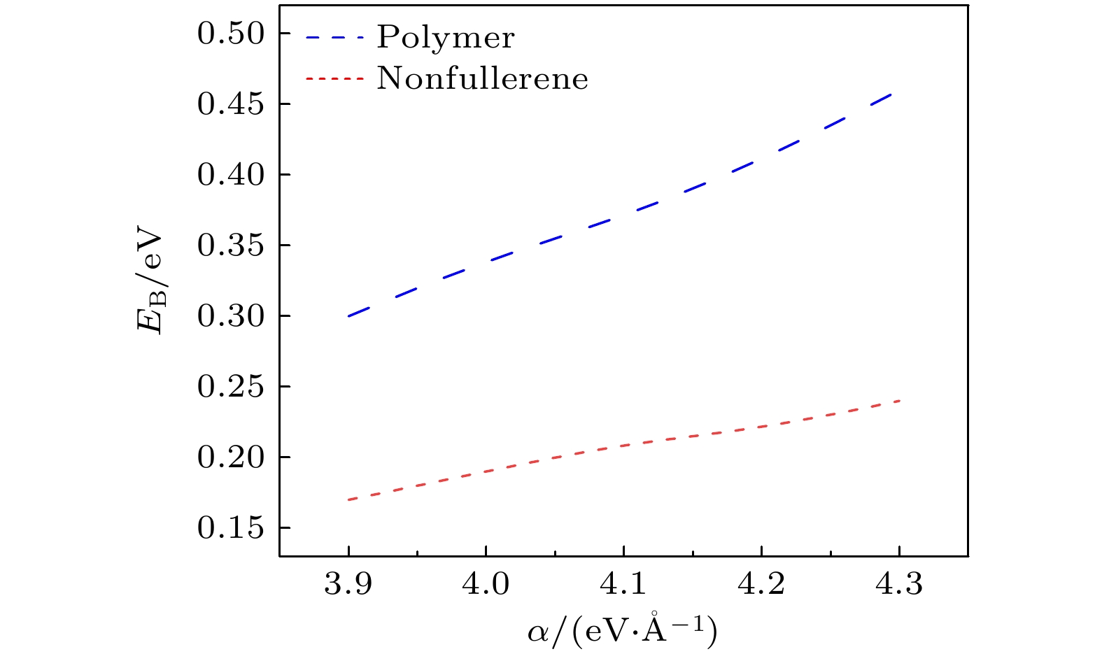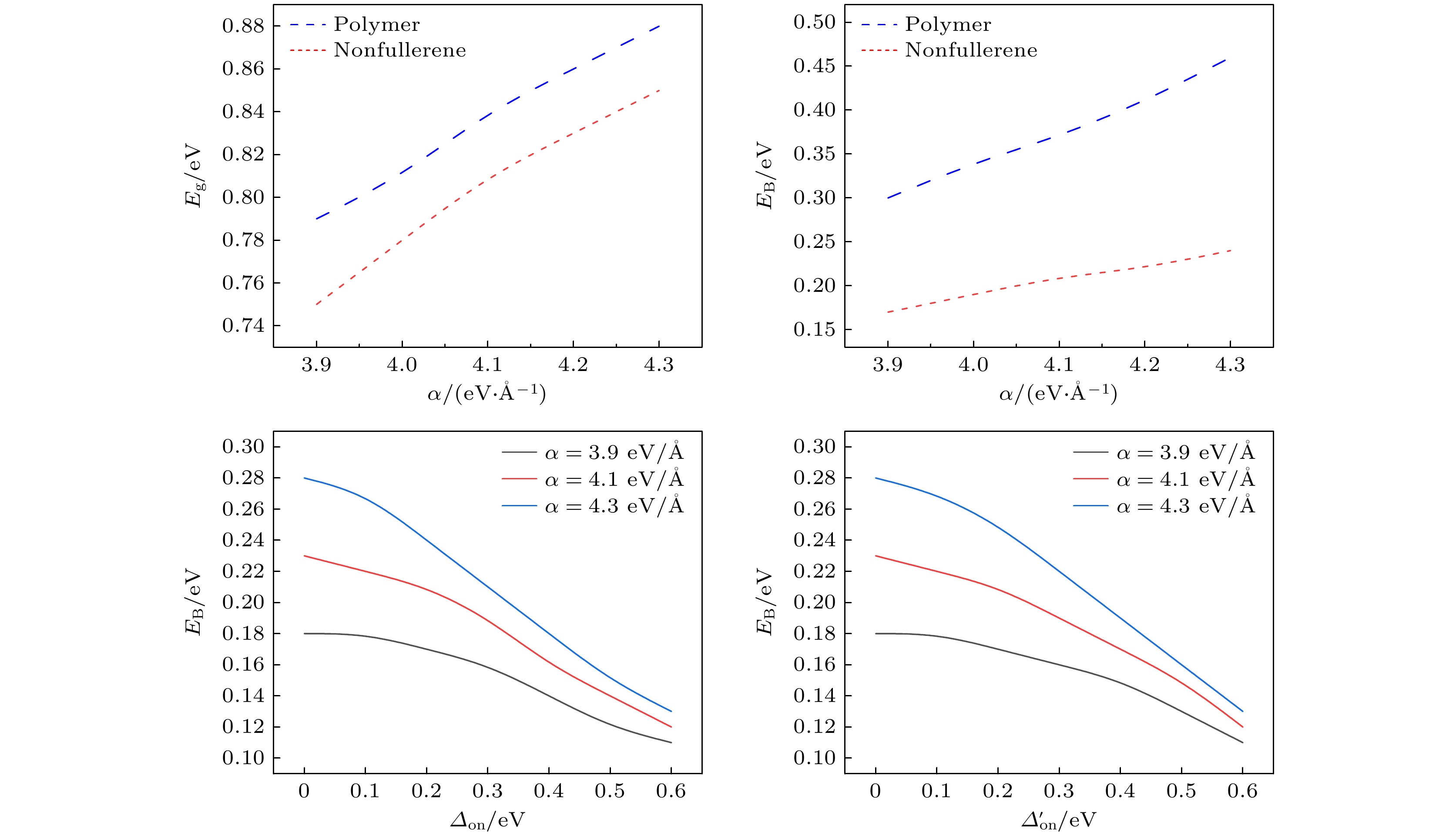 Fig. 7. Binding energy (EB) of excited states in the non-fullerene molecule as a function of (a) the electron-donating ability of the central group ($ {\varDelta _{{\text{on}}}} $) and (b) the electron-withdrawing ability of the end group ($ {\varDelta '_{{\text{on}}}} $) when the electron-lattice interaction constants is $ \alpha {\text{ = 3}}{\text{.9 eV/{\AA}}} $, $ \alpha {\text{ = 4}}{\text{.1 eV/{\AA} }} $, and $ \alpha {\text{ = 4}}{\text{.3 eV/{\AA} }} $, respectively.