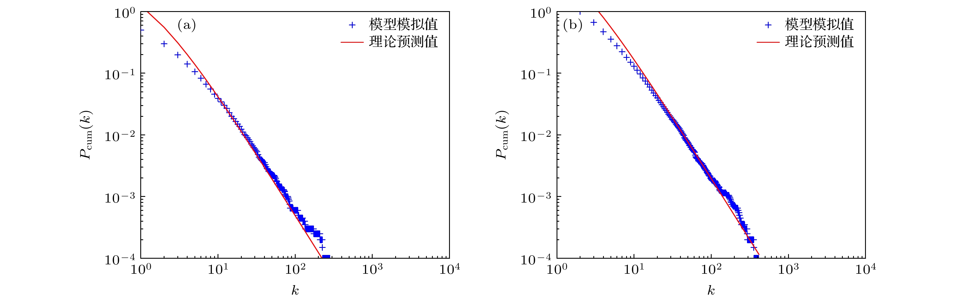图 3 $ d=2 $时模型的累积度分布与理论预测曲线. 横轴是度, 纵轴是累积度分布$ {P}_{\mathrm{c}\mathrm{u}\mathrm{m}}\left(k\right) $, 蓝色+表示模型的模拟值, 红色实线对应于方程(5)给出的理论预测值, 幂律指数为$ \tau =2 $ (a) $ m=1 $时模型的累积度分布模拟值与理论预测曲线; (b) $ m=2 $时模型的累积度分布模拟值与理论预测曲线