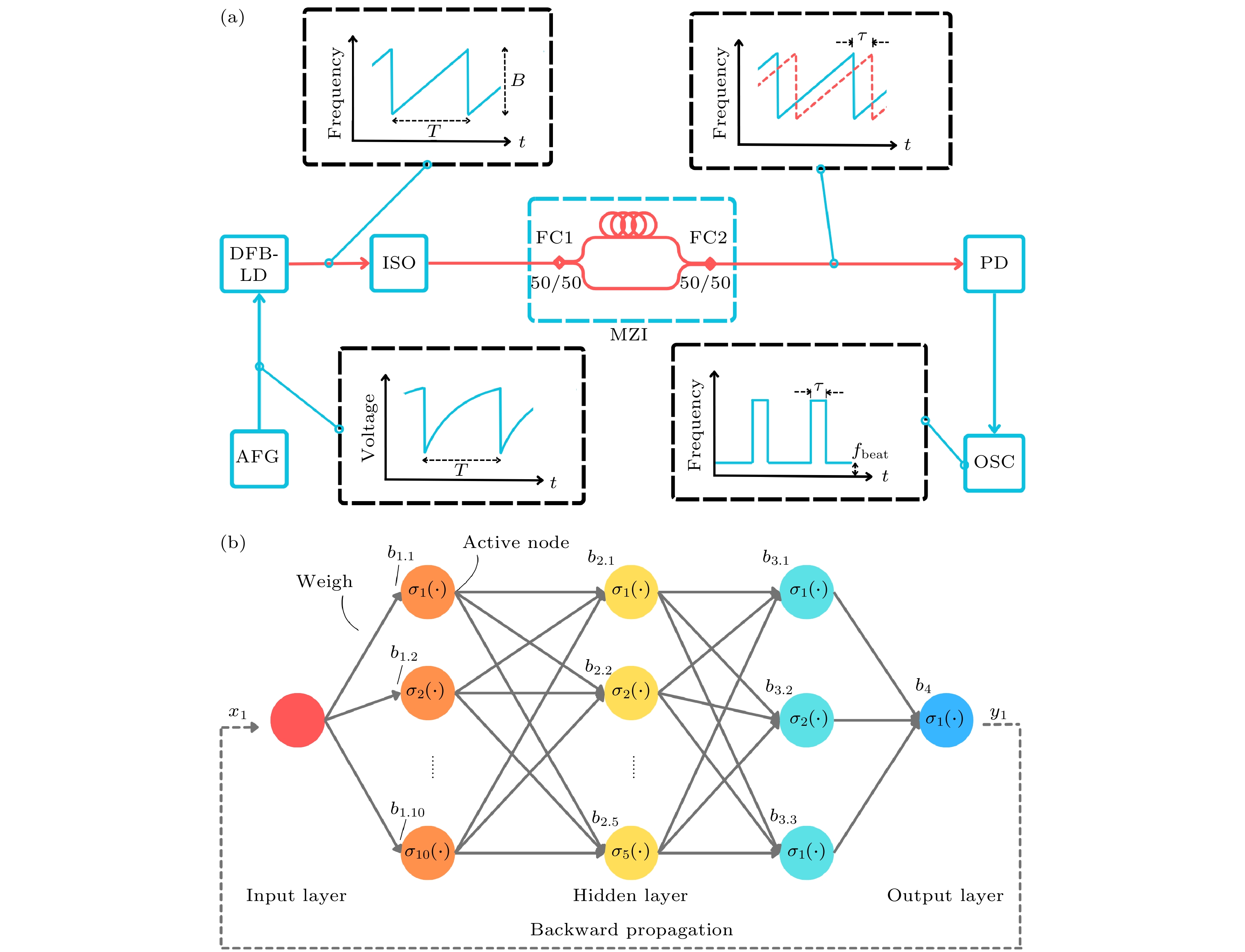 Fig. 3. FNN-based frequency sweep nonlinearity predistortion scheme for FMCW LiDAR: (a) Experimental system of the FNN-based frequency sweep nonlinearity predistortion scheme for FMCW LiDAR; (b) schematic diagram of the constructed FNN.