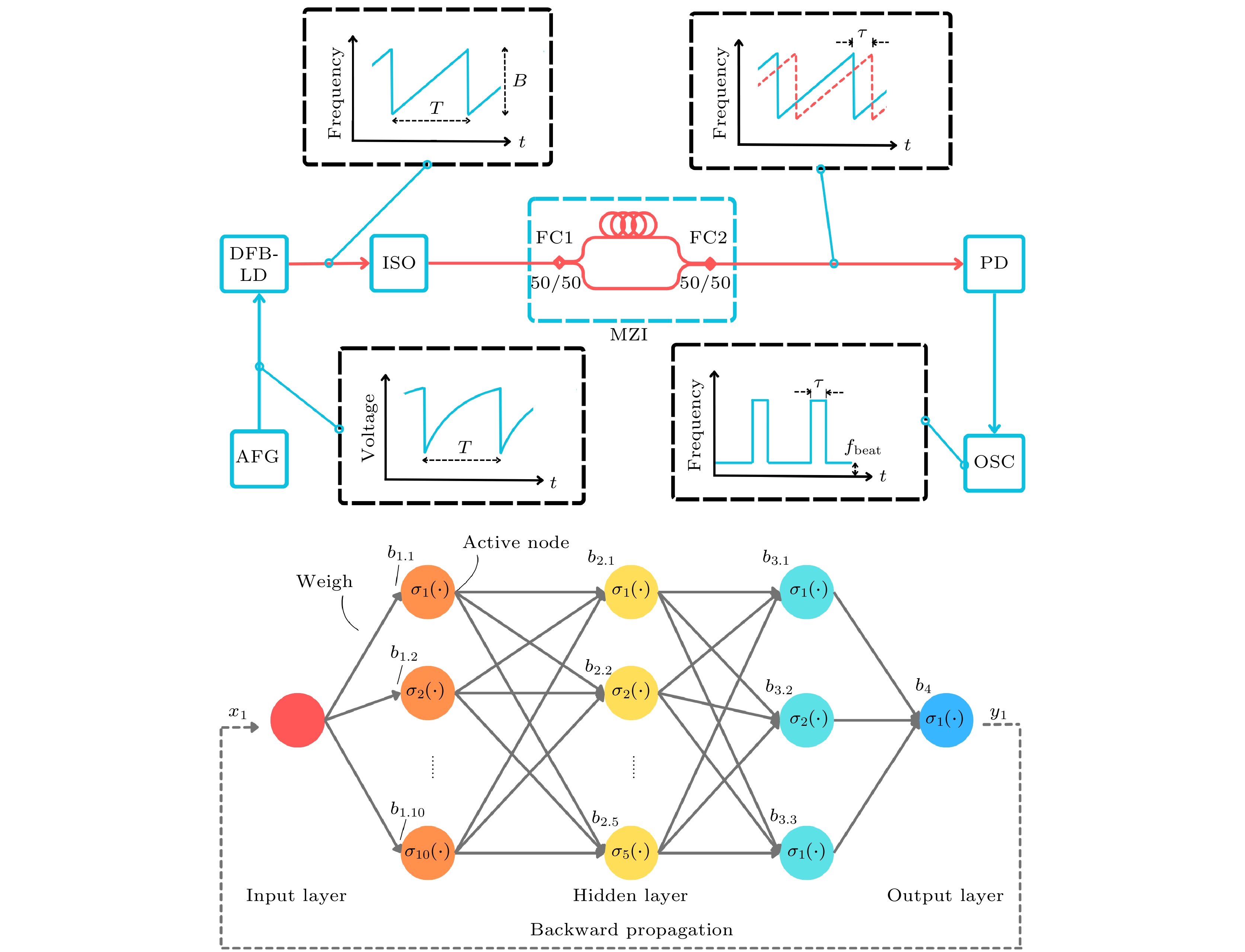 发射源的高度扫频线性是调频连续波激光雷达实现高精确测量的必备条件. 针对目前基于电流调制分布式反馈半导体激光器产生的调频连续波信号存在扫频非线性问题, 本文提出了基于前馈神经网络的扫频非线性预失真方案. 该方案首先通过实验获取分布式反馈半导体激光器在调制电流为锯齿波情形下输出的时频曲线; 将锯齿波调制电流作为输入, 时频曲线作为输出, 基于前馈神经网络获取输入到输出的非线性映射关系; 接下来, 利用反向传播算法生成能补偿分布式反馈半导体激光器输出非线性的预失真调制电流波形. 针对调制电流频率处于1—10 kHz的情形进行实验研究, 结果表明, 采用基于前馈神经网络的扫频非线性矫正方案后, 分布式反馈半导体激光器所产生的调频连续波信号的扫频非线性从之前的10–3量级降低到10–5量级; 残差均方根值从之前的百MHz量级降低到十MHz量级. 本文提出的扫频非线性预失真校正方案有望为高精度的调频连续波激光雷达系统的扫频信号线性化技术提供新思路.To address the frequency sweeping nonlinearity of frequency-modulated continuous-wave signals generated by a current-modulated distributed feedback laser diode, we propose and experimentally demonstrate a pre-distortion method based on a feedforward neural network. For this method, the beat frequency signals of the distributed feedback laser diode under a sawtooth-waveform current modulation are first experimentally obtained, and then the time-frequency curves of the distributed feedback laser diode output are obtained by performing a Hilbert transform on the beat signals. Subsequently, three-layer feedforward neural networks with 10, 5, and 3 hidden-layer neurons are constructed, respectively. By taking the driving current and the time-frequency curves as the input and output of the feedforward neural network, respectively, the nonlinear mapping relationship between them is established. Finally, a backpropagation algorithm is utilized to obtain the pre-distortion modulation current. Taking this current under the modulation frequency from 1 kHz to 10 kHz to drive the distributed feedback semiconductor laser (DFB-LD), the performance of the generated frequency-modulated continuous-wave (FMCW) signals is analyzed. We use nonlinear regression coefficients and residual root mean square values to characterize the performance. For the modulation frequency set at 4 kHz, the frequency sweeping nonlinearity and the residual root mean square value are reduced from 5.29 × 10–3 and 281 MHz to 1.77 × 10–5 and 15.15 MHz, respectively. With the modulation frequency fixed at 6 kHz, the frequency sweeping nonlinearity decreases from 5.58 × 10–3 to 1.52 × 10–5 and the residual root mean square declines from 251.98 MHz to 12.17 MHz in the proposed scheme. Across the entire tested frequency range from 1 kHz to 10 kHz, the nonlinearity remains stable at ~10–5 after adopting the pre-distortion scheme, with RMS values consistently below 20 MHz. The proposed method is expected to provide a new scheme for the linearization technology of the sweep signal in high-precision frequency-modulated continuous-wave light detection and ranging systems.