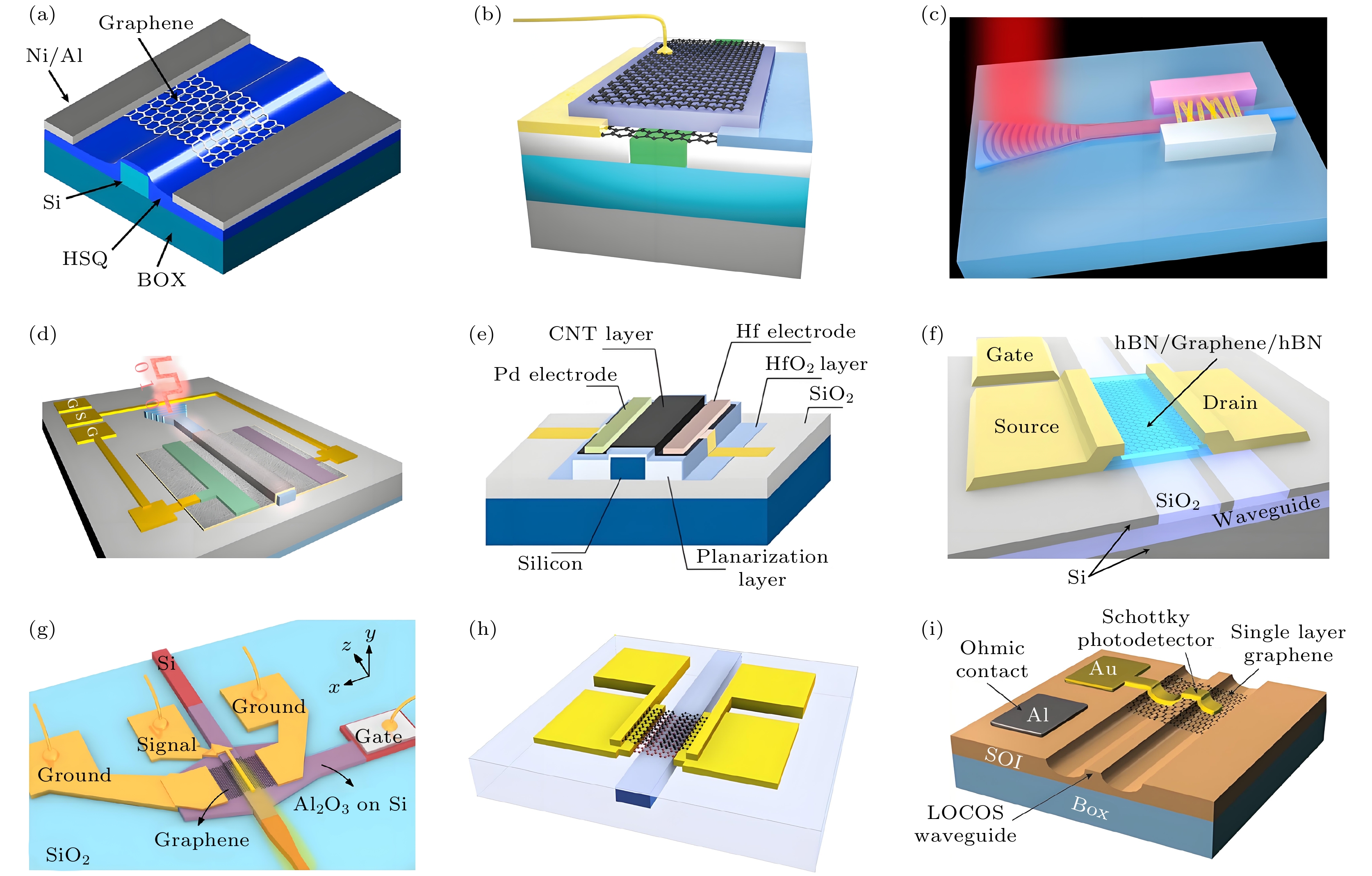 Fig. 7. (a) Graphene photodetector integrated on a silicon waveguide with asymmetric contact configuration, reproduced with permission from Ref. [49]; (b) schematic illustration of the dual layer graphene modulator/detector integrated on a planarized waveguide, reproduced with permission from Ref. [51]; (c) schematic diagram showing the structure of a waveguide-integrated carbon nanotube photodiode, reproduced with permission from Ref. [52]; (d) silicon waveguide-integrated carbon nanotube photodetector with low dark current and 48 GHz bandwidth, reproduced with permission from Ref. [53]; (e) high-speed carbon nanotube photodetector based on a planarized silicon waveguide, reproduced with permission from Ref. [54]; (f) the hBN/SLG/hBN photodetector on a buried silicon waveguide, reproduced with permission from Ref. [55]; (g) structures of the high-performance silicon–graphene hybrid plasmonic waveguide photodetectors, reproduced with permission from Ref. [57]; (h) 3D schematic of the PTE graphene photodetector, reproduced with permission from Ref. [58]; (i) silicon–Graphene plasmonic Schottky photodetector, reproduced with permission from Ref. [59]