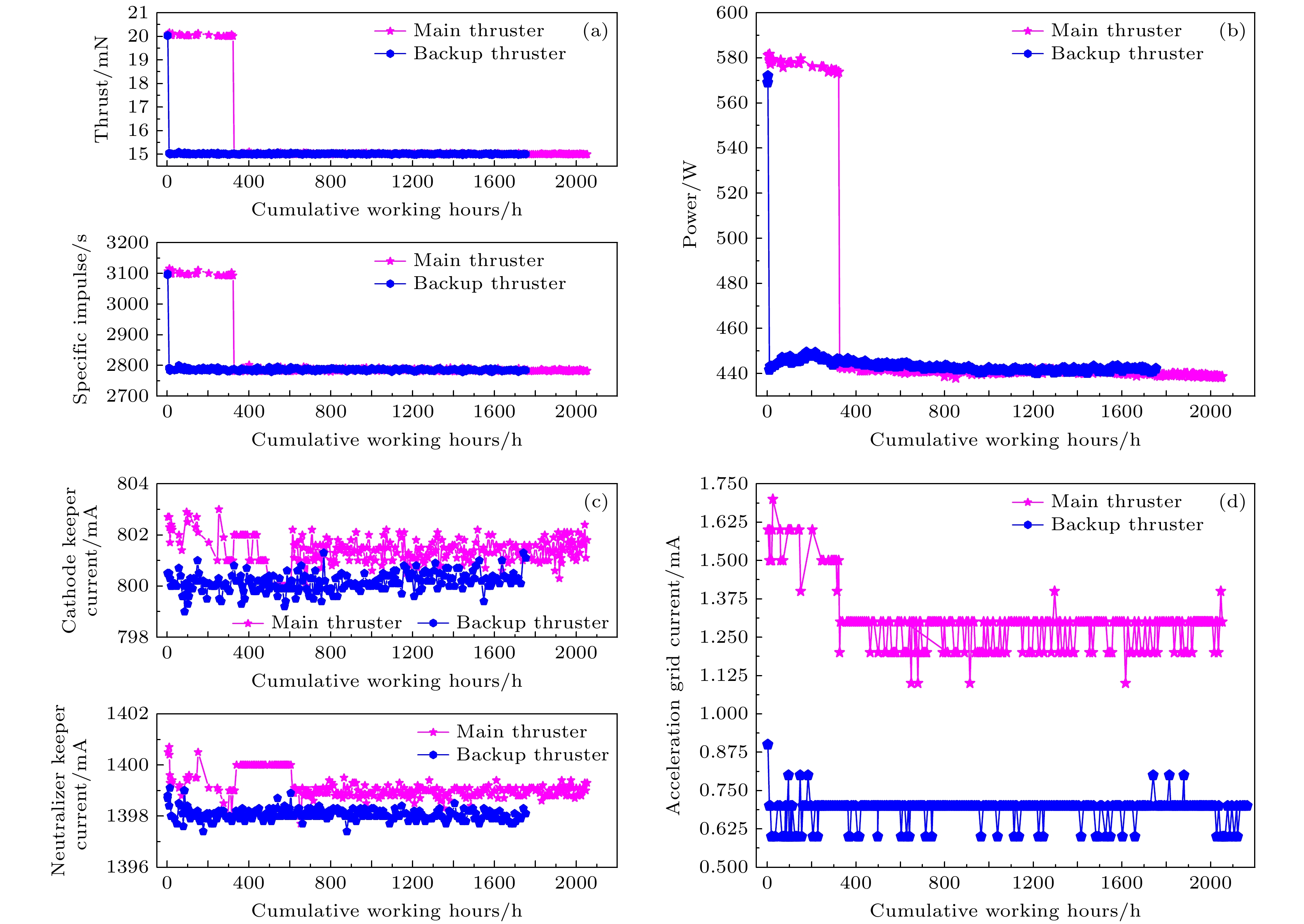 Fig. 14. Variation of main operating parameters during high-precision orbital maintenance at a single thrust point for the ion thruster: (a) Thrust and specific impulse; (b) power; (c) cathode keeper current and neutralizer keeper current; (d) acceleration grid current.
