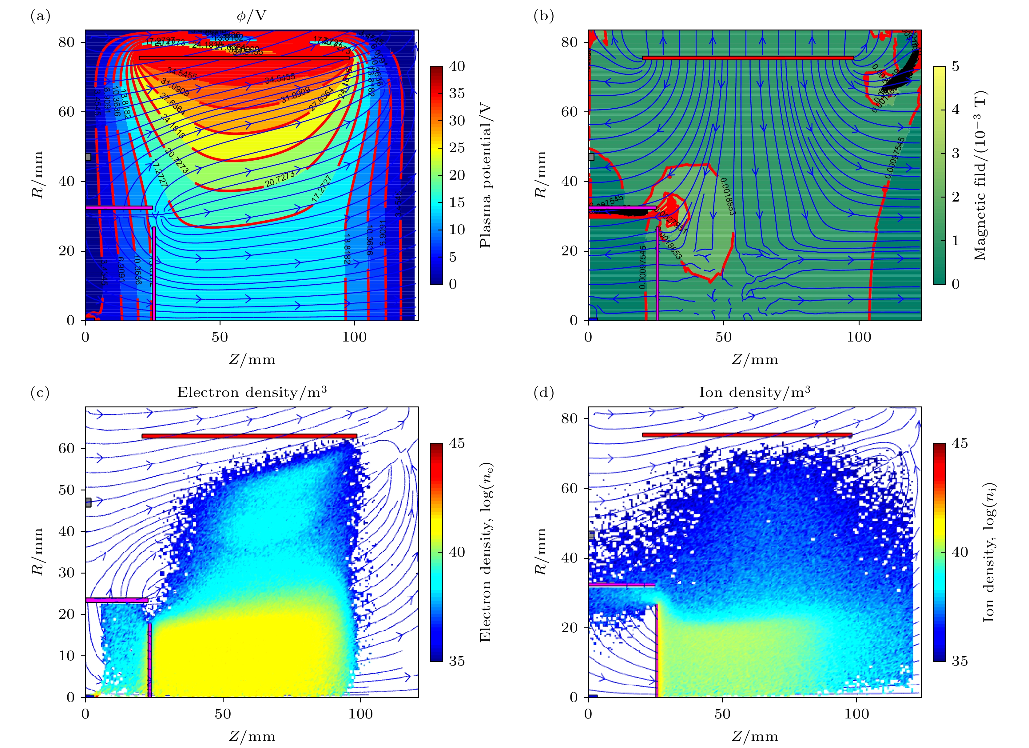 图 3 大推力高功率工作点下放电室电磁场及等离子体特征参数分布 (a) 电势等势线与磁力线; (b) 电场线与磁场等势线; (c) 稳态时放电室内电子分布; (d) 稳态时放电室内离子密度分布