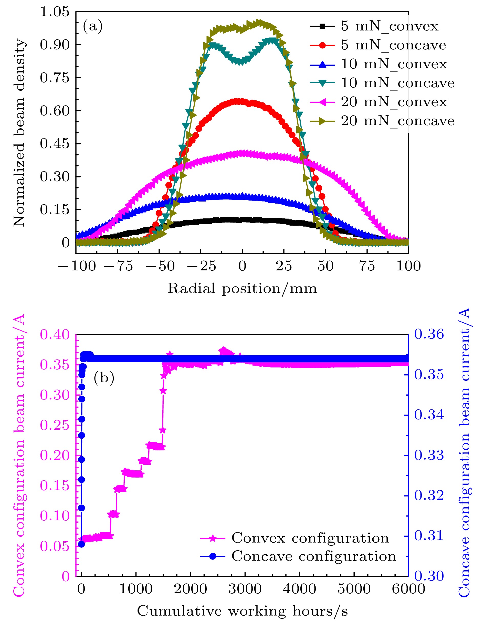 Fig. 5. Comparison of extracted beam current density distribution and cold-start characteristics for two different surface forms of the ion optics system: (a) Comparison of extracted beam current density distribution; (b) comparison of extracted beam current characteristic curves at –90 ℃ low-temperature environment.