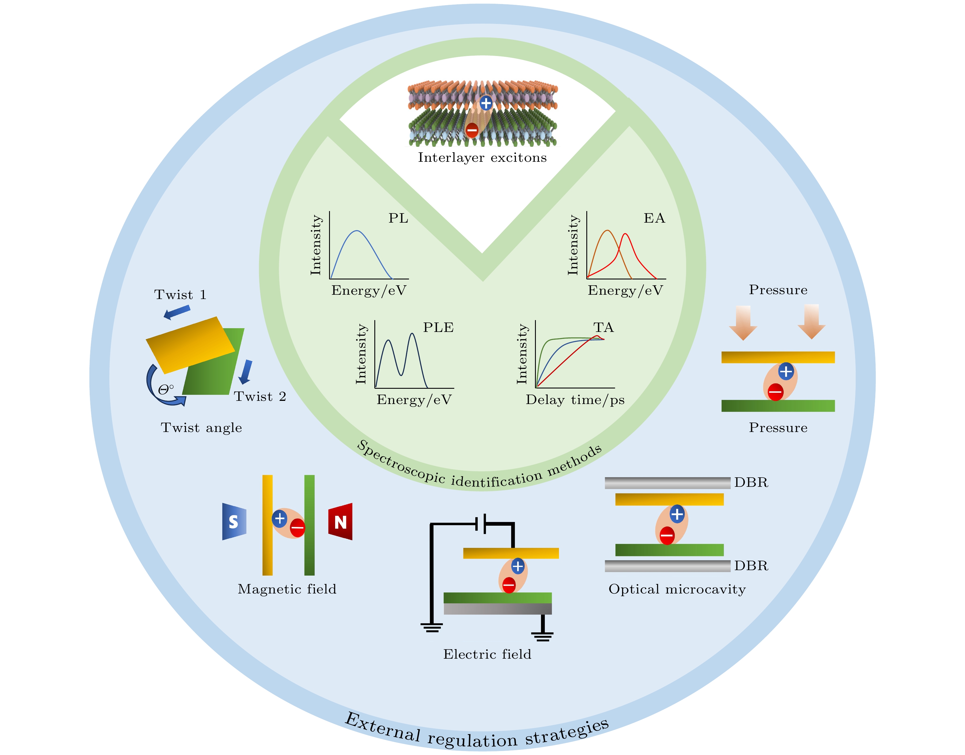 Fig. 1. Schematic of interlayer exciton identification and regulation. The center illustrates the spatial configuration of interlayer excitons and representative spectroscopic techniques (PL, PLE, EA, TA), surrounded by common external tuning approaches such as electric field, magnetic field, pressure, optical microcavity, and twist angle.
