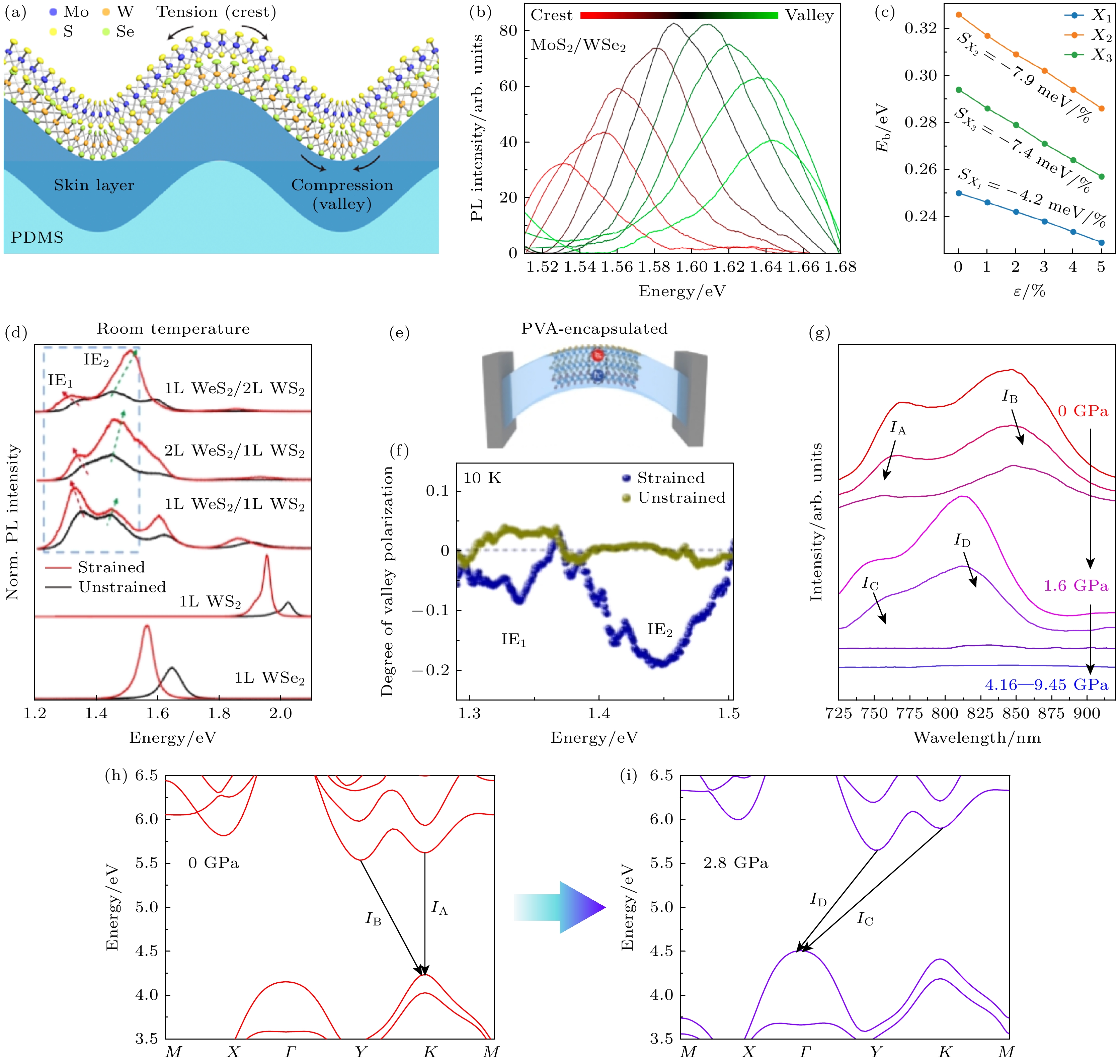 Fig. 6. Strain-engineered interlayer excitons: (a) Schematic of periodic wrinkle structures in MoS2/WSe2 heterobilayers, where peak and valley regions introduce tensile and compressive strains, respectively, reproduced with permission from Ref. [69]; (b) continuous tuning of exciton emission peak energy along the wrinkle profile, showing a total modulation range of 107 meV, reproduced with permission from Ref. [69]; (c) GW+BSE calculated binding energies of interlayer and intralayer excitons under biaxial strain in MoSe2/WSe2 heterostructures, reproduced with permission from Ref. [70]; (d), (e) PL enhancement and valley polarization effects (20% polarization degree at 10 K) in WSe2/WS2 heterostructures under tensile strain, reproduced with permission from Ref. [71]; (f) schematic of strain-induced valley potential inequality, reproduced with permission from Ref. [71]; (g) evolution of excitonic states and band rearrangement in WSe2/MoSe2 heterostructures under hydrostatic pressure, reproduced with permission from Ref. [65]; (h), (i) schematic of pressure-induced band rearrangement (low-pressure vs. high-pressure band alignment), reproduced with permission from Ref. [65].
