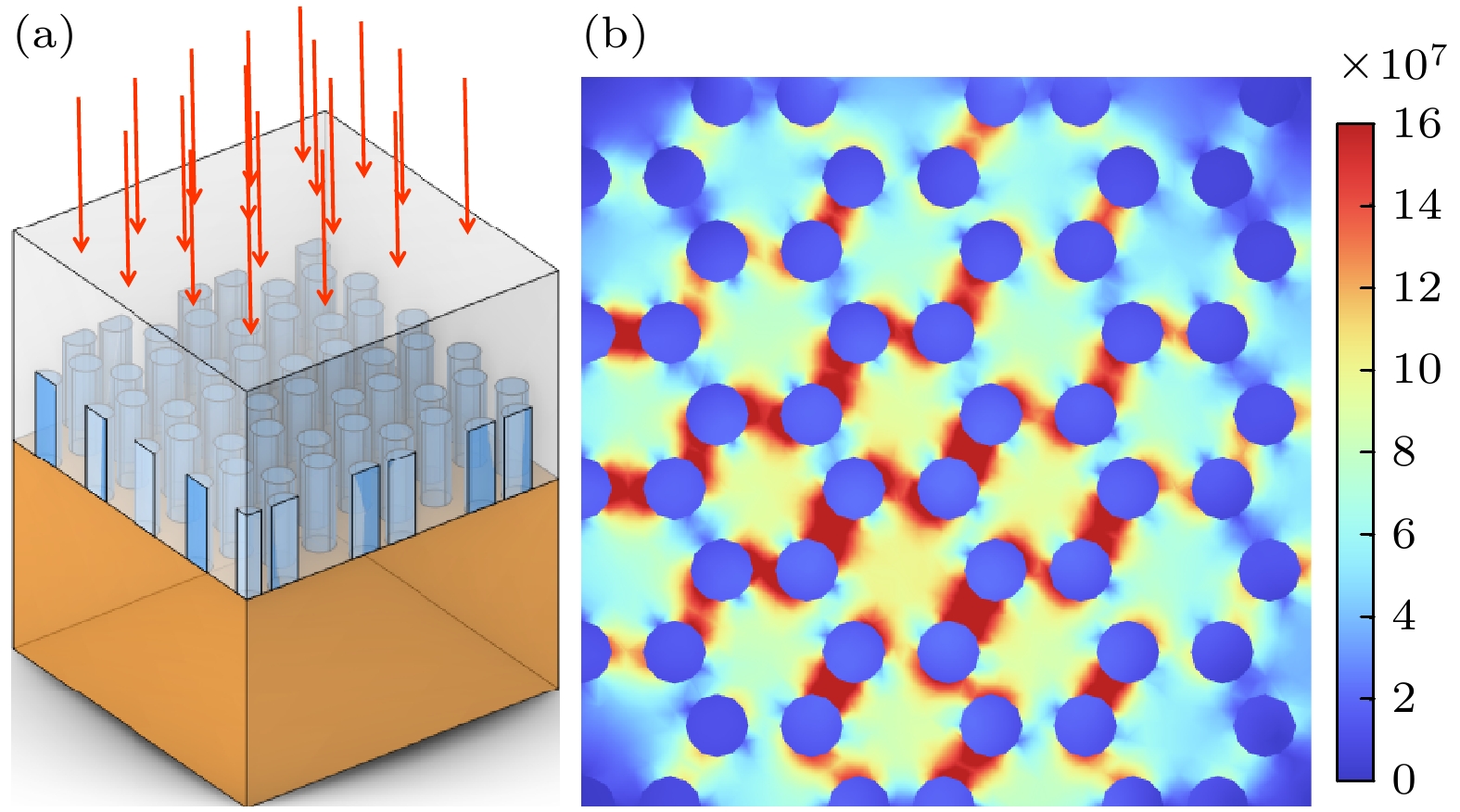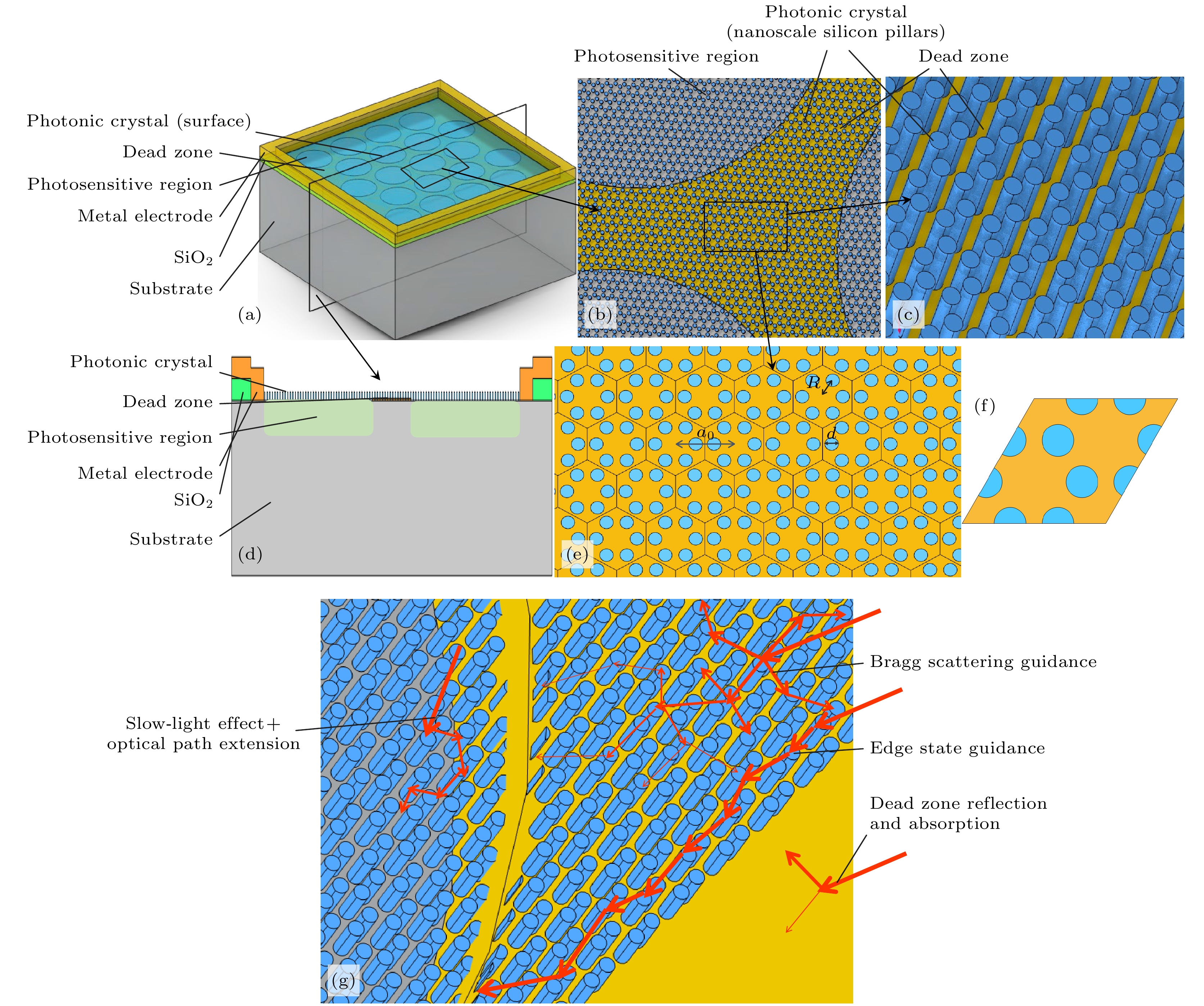 硅光电倍增管(SiPM)在微弱光探测领域已获得广泛应用. 然而基于小尺寸G-APD单元的SiPM存在有效GFF受限问题, 使其光子探测效率(PDE)相对较低. 此外, 受硅材料本征特性制约, 其在近红外波段的PDE亦相对不足. 针对上述问题, 本文提出一种基于拓扑光子晶体(TPC)的分区域光场调控方案, 旨在不改变SiPM内部结构的前提下提升其PDE. 通过COMSOL电磁波频域仿真, 揭示了死区拓扑边缘态引导、光敏区慢光效应及布拉格散射的多波段协同机制: 在460—700 nm波段, 死区蜂窝晶格通过Floquet周期性分析诱导拓扑边缘态, 同时利用晶格周期性介电分布激发布拉格散射, 减少光子在金属表面的反射损耗, 将光子精准耦合至光敏区, 其在621 nm处的有效GFF从46.4%提升至63.1%; 在700—1100 nm波段, 蜂窝晶格周期性介电分布进一步激发布拉格共振, 减少金属表面反射损耗, 同时多重散射机制显著延长光子在死区的传播路径, 提升与光敏区耦合概率; 设计的光敏区周期性硅柱结构通过慢光效应有效延长了光子横向传播路径, 同时布拉格散射减少反射损耗, 其在900 nm处的吸收效率由41.19%显著提升至51.37%. 仿真结果表明, 该设计方案使SiPM在460—1100 nm波段PDE平均提升50%(峰值达81%), 可以通过主流的刻蚀工艺(电子束光刻+反应离子刻蚀)实现. 与传统微透镜及等离激元结构相比, TPC在宽光谱响应与工艺简化方面具有显著优势. 本研究为SiPM的光子回收与PDE增强提供了拓扑光子学新路径.Silicon photomultipliers (SiPMs) have been widely used in the field of weak light detection. However, SiPMs utilizing small-sized Geiger-mode avalanche photodiode (G-APD) cells face the limitations due to a restricted effective geometric fill sactor (GFF), which leads to relatively low photon detection efficiency (PDE), and additionally, constrained by the intrinsic properties of silicon materials, their PDE in the near-infrared band is also relatively insufficient. To address the above issues, this work proposes a regional optical field modulation approach based on topological photonic crystals (TPCs), aiming to improve the PDE of SiPMs without modifying their internal structure. Through COMSOL electromagnetic wave frequency-domain simulation, the multi-band synergistic mechanism of dead-zone topological edge state guidance, photosensitive region slow-light effect, and Bragg scattering is revealed. In the 460–700 nm band, the honeycomb lattice in the dead zone induces topological edge states via Floquet periodic analysis, while the periodic dielectric distribution of the lattice excites Bragg scattering to reduce photon reflection loss at the metal surface and precisely couples photons to the photosensitive region, leading to an increase in effective GFF from 46.4% to 63.1% at 621 nm. In the 700–1100 nm band, the periodic dielectric distribution of the honeycomb lattice further excites Bragg resonance to reduce metal surface reflection loss, and simultaneously, the multiple scattering mechanism substantially extends the propagation path of photons in the dead zone to improve the coupling probability with the photosensitive region. The designed periodic silicon pillar structure in the photosensitive region effectively extends the lateral propagation path of photons through the slow-light effect, while Bragg scattering reduces reflection loss, resulting in a significant increase in absorption efficiency from 41.19% to 51.37% at 900 nm. Simulation results show that this design scheme increases the average PDE of SiPMs by 50% in the 460–1100 nm band (with a peak value of 81%) and can be implemented via mainstream etching processes (electron beam lithography + reactive ion etching). Compared with traditional microlens and plasmonic structures, TPCs exhibit significant advantages in broad-spectrum response and process simplification. This work provides a new topological photonics approach for photon recycling and PDE enhancement of SiPMs.