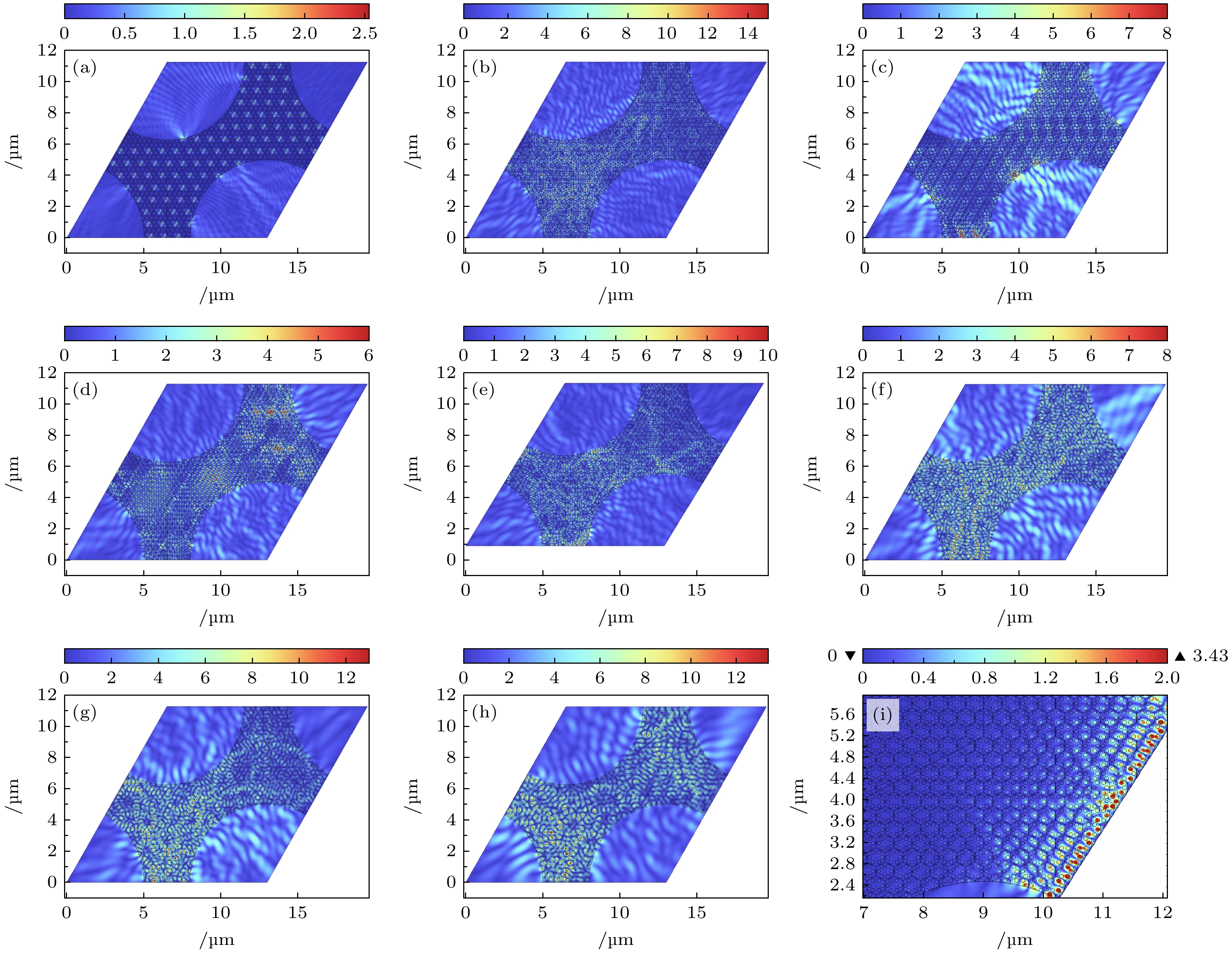 图 4 不同波长下死区构建TPC的电场模分布图(单位: V) (a) 450 nm; (b) 550 nm; (c) 621 nm; (d) 650 nm; (e) 700 nm; (f) 800 nm; (g) 900 nm; (h) 1100 nm; (i) 621 nm波长下的边界态传播