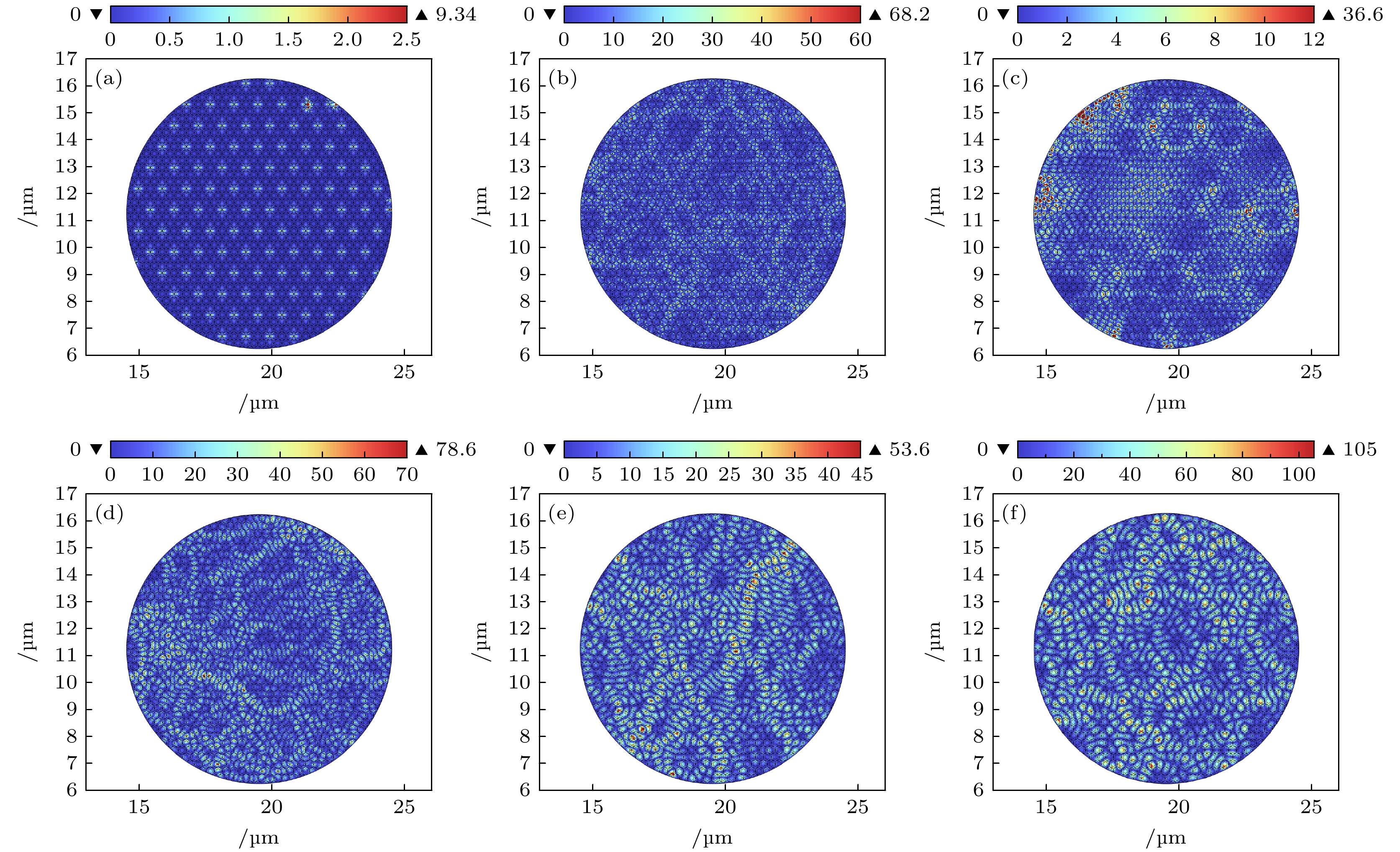 图 5 不同波长下光敏区构建TPC的电场模分布图(单位: V) (a) 460 nm; (b) 550 nm; (c) 650 nm; (d) 700 nm; (e) 900 nm; (f) 1100 nm