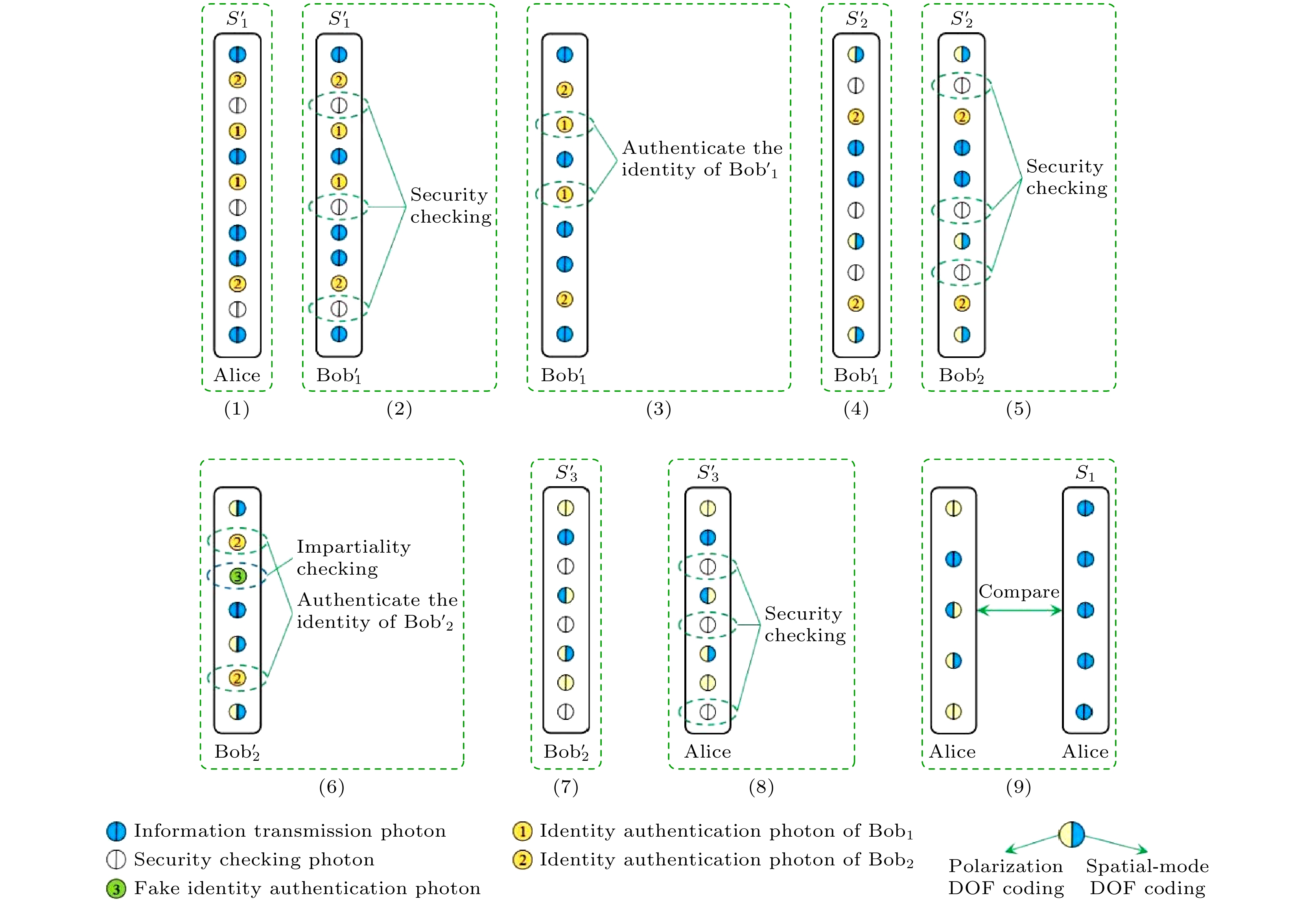 The absolute security of quantum communication protocols relies on a critical premise: all participating parties are legitimate users. Ensuring the legitimacy of participant identities is paramount in complex real-world communication environments. Quantum identity authentication (QIA), in which fundamental principles of quantum mechanics are used to achieve unilateral or mutual authentication between communicating parties, constitutes an indispensable core component for building a comprehensive quantum secure communication system. It holds significant research value in the field of quantum communication. This review employs a comparative classification method to systematically outline the research trajectory of QIA protocols. By categorizing protocols based on the required quantum resources and the types of quantum protocols employed, the advantages and disadvantages of various categories are analyzed in terms of efficiency, security, and practicality. Single-photon protocols require low resources, and they are easy to implement, and compatible with existing optical components, but require high-efficiency single-photon detectors and exhibit weak noise resistance. Entangled-state protocols offer high security and strong resistance to eavesdropping, particularly suitable for long-distance or multi-party authentication. However, they greatly depend on the preparation and maintenance of high-precision, stable multi-particle entanglement sources, resulting in high experimental complexity. Continuous-variable (CV) protocols achieve high transmission efficiency in short-distance metropolitan area networks and are compatible with classical optical communication equipment, making experiments relatively straightforward. Yet, they require high-precision modulation technology and are sensitive to channel loss. Hybrid protocols aim to balance resource efficiency and security while reducing reliance on a single quantum source, but their design is complex and may introduce new attack vectors. Quantum key distribution (QKD) framework protocols embed identity authentication in the key distribution process, making them suitable for scenarios requiring long-term secure key distribution, although they often depend on pre-shared keys or trusted third parties. Quantum secure direct communication (QSDC) framework protocols integrate authentication with secure direct information transmission, offering high efficiency for real-time communication, but requiring high channel quality. Measurement-device-independent QSDC (MDI-QSDC) represents a key development direction that can resist attacks on measurement devices. Quantum teleportation (QT) framework protocols achieves cross-node authentication and unconditional security, making it suitable for quantum relay networks despite its high experimental complexity. The entanglement swapping framework protocol can resist conspiracy attacks and is suitable for multi-party joint scenarios, but it consumes a lot of resources and relies on trusted third party. Ping-pong protocol framework supports dynamic key updates and exhibits strong resistance to eavesdropping, making it suitable for temporary authentication on mobile terminals, although it typically only supports unilateral authentication and requires a bidirectional channel. Subsequently, this review details the latest QIA protocols of our research group, including a multi-party synchronous identity authentication protocol based on Greenberger-Horne-Zeilinger (GHZ) states, and a tripartite QSDC protocol with identity authentication capabilities utilizing polarization-spatial super-coding. The GHZ-based multi-party synchronous authentication protocol leverages the strong correlations inherent in GHZ states to achieve simultaneous authentication among multiple parties. Through a carefully designed two-round decoy-state detection mechanism, it effectively resists both external eavesdropping and internal attacks originating from authenticated users, thereby enhancing the efficiency and security of identity management in large-scale quantum networks. The core innovation of the polarization-spatial super-coding tripartite QSDC protocol lies in its deep integration of the authentication process with information transmission by utilizing the spatial degrees of freedom of single photons. This design accomplishes the identity verification of two senders and the transmission of secret information within a single protocol run, ensuring end-to-end security through a three-stage security check. This “authentication-as-communication” paradigm significantly improves the overall efficiency and practicality of the protocol. Its successful implementation also relies on advancements in quantum memory technology. Finally, the review outlines future research directions for quantum identity authentication and explores its potential applications in quantum communication. The QIA research needs to focus on reducing resource dependency, exploring more efficient protocol designs, further enhancing protocol integration and robustness, prioritizing the development of protocols adaptable to real-world environments, and actively investigating integration with novel scenarios. This comprehensive review aims to provide theoretical research foundations and technical support for the practical development of future quantum identity authentication. [1] Goldenberg L, Vaidman L 1995 Phys. Rev. Lett. 75 1239