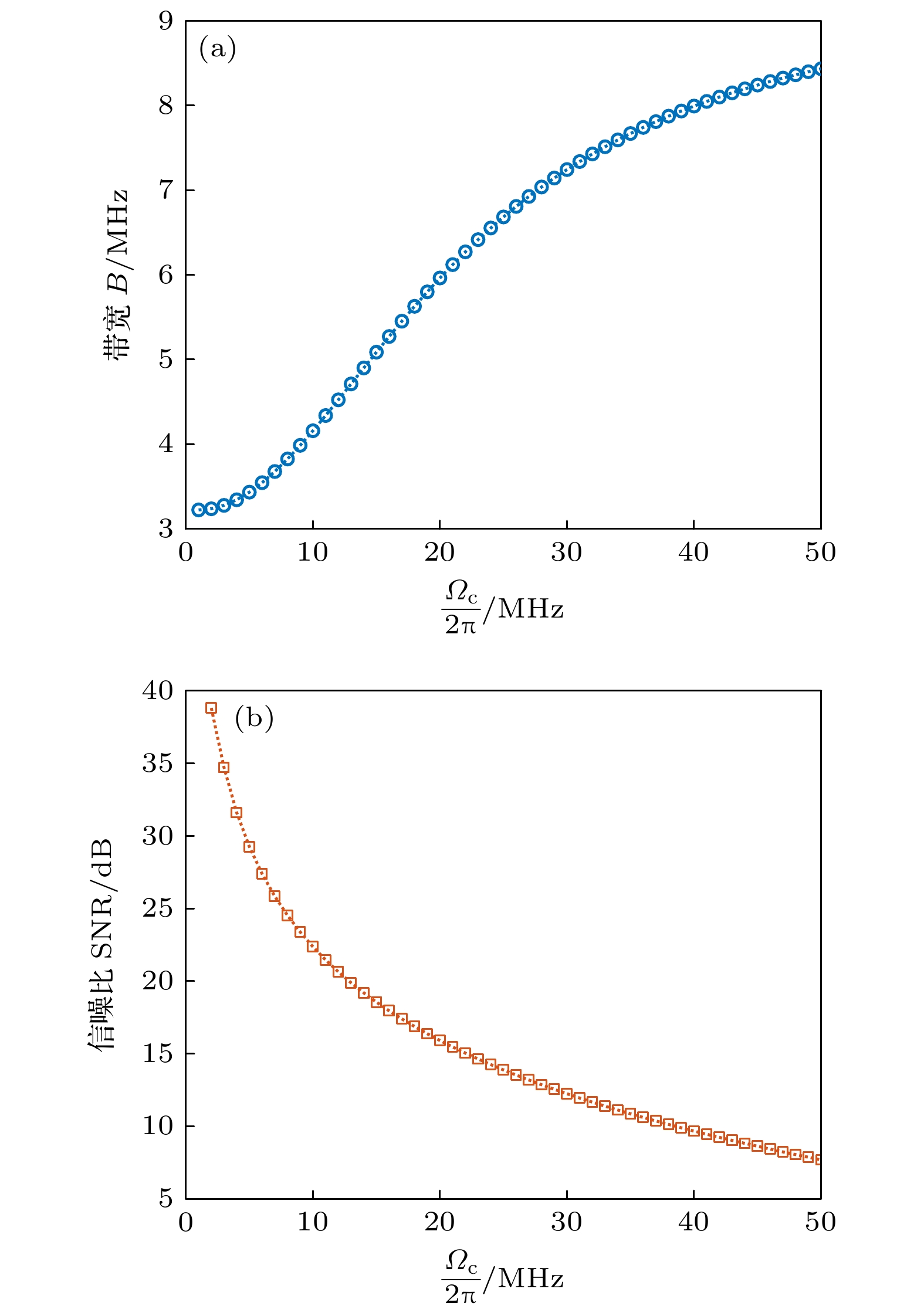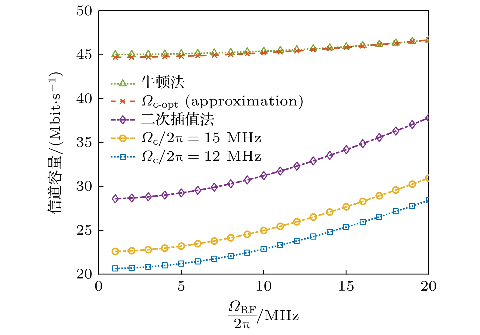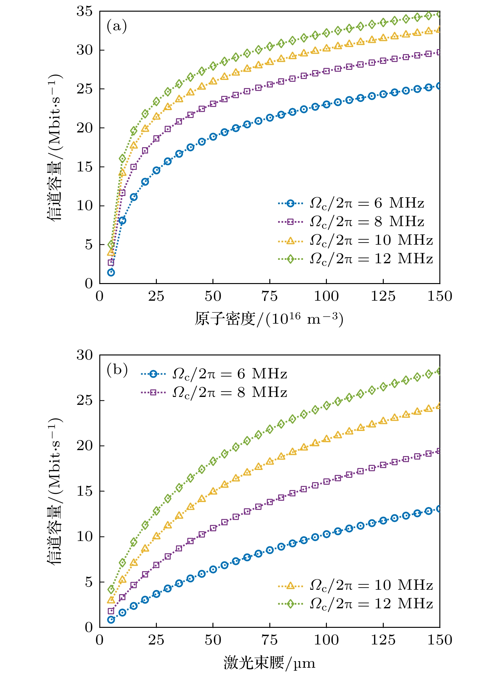 拉比频率$ {\varOmega _{\text{p}}} $从$ 2\pi \times 1{\text{ MHz}} $提升至$ 2\pi \times 3{\text{ MHz}} $, 信道容量提升约1 Mbit/s