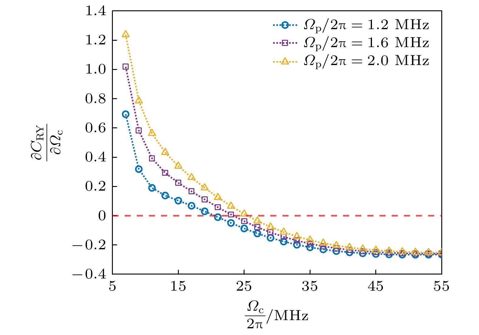 Fig. 4. $ {{\partial {C_{{\text{Ry}}}}} \mathord{\left/ {\vphantom {{\partial {C_{{\text{Ry}}}}} {\partial {\varOmega _{\text{c}}}}}} \right. } {\partial {\varOmega _{\text{c}}}}} $ versus $ {\varOmega _{\text{c}}} $.