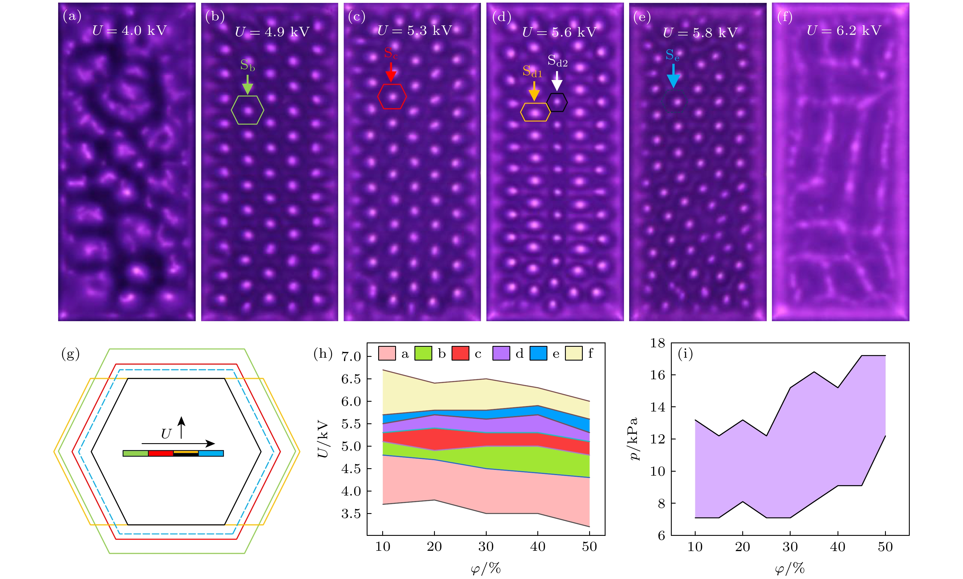 图 2 随着外加电压的增加斑图的演化序列 (a) 随机放电丝, U = 4.0 kV; (b) 蜂窝超点阵斑图, U = 4.9 kV; (c) 蜂窝框架加厚的蜂窝超点阵斑图, U = 5.3 kV; (d) 类蜂窝超点阵斑图, U = 5.6 kV; (e) 不稳定的蜂窝超点阵斑图, U = 5.8 kV; (f) 模糊条纹状, U = 6.4 kV; (g) 不同蜂窝斑图中蜂窝框架子点阵的示意图; (h) 斑图(a)—(f)的电压U与氩气含量φ的相图; (i) 类蜂窝超点阵斑图的气压p与氩气含量φ的相图