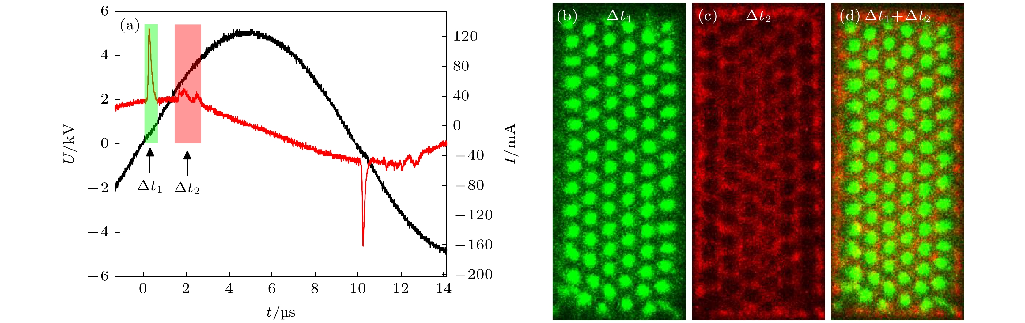 Fig. 5. Instantaneous images of the honeycomb superlattice pattern: (a) Waveforms of the voltage and the current (Δt1 = 560 ns, Δt2 = 2000 ns); (b), (c) images exposed corresponding to the current pulse phases denoted by ∆t1 and ∆t2 in (a), respectively, and the images are integrated for 100 voltage cycles; (d) superposition of panels (b), (c).
