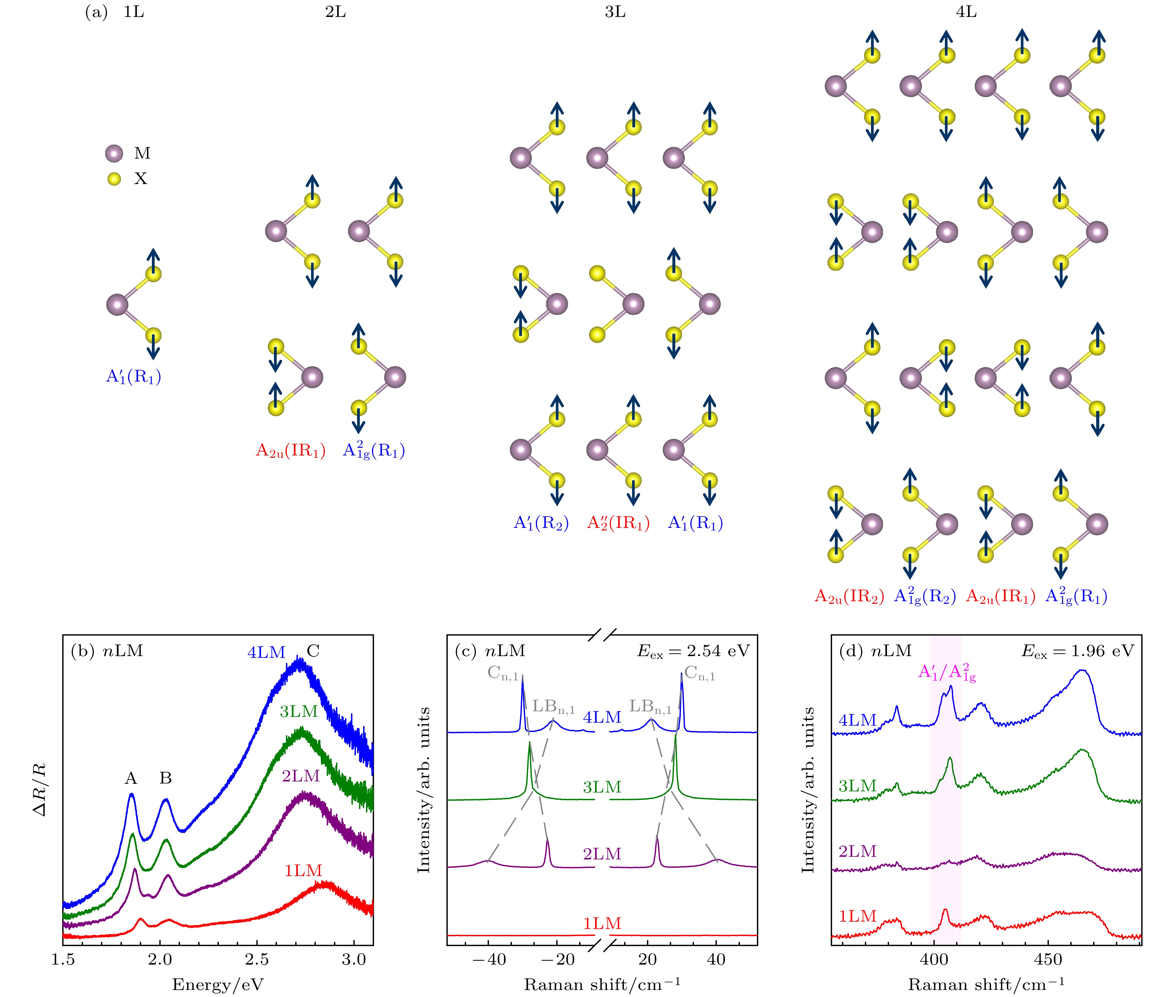 Fig. 1. Davydov components of A-mode in intrinsic MoS2: (a) Schematic diagram of atomic displacements for all the Davydov components of A-mode in 1–4L TMDs; (b) differential reflectance spectra of intrinsic 1–4LM; (c) low-frequency modes of intrinsic 1–4LM; (d) failure to observe all the Davydov components of A-mode in intrinsic 1–4LM.