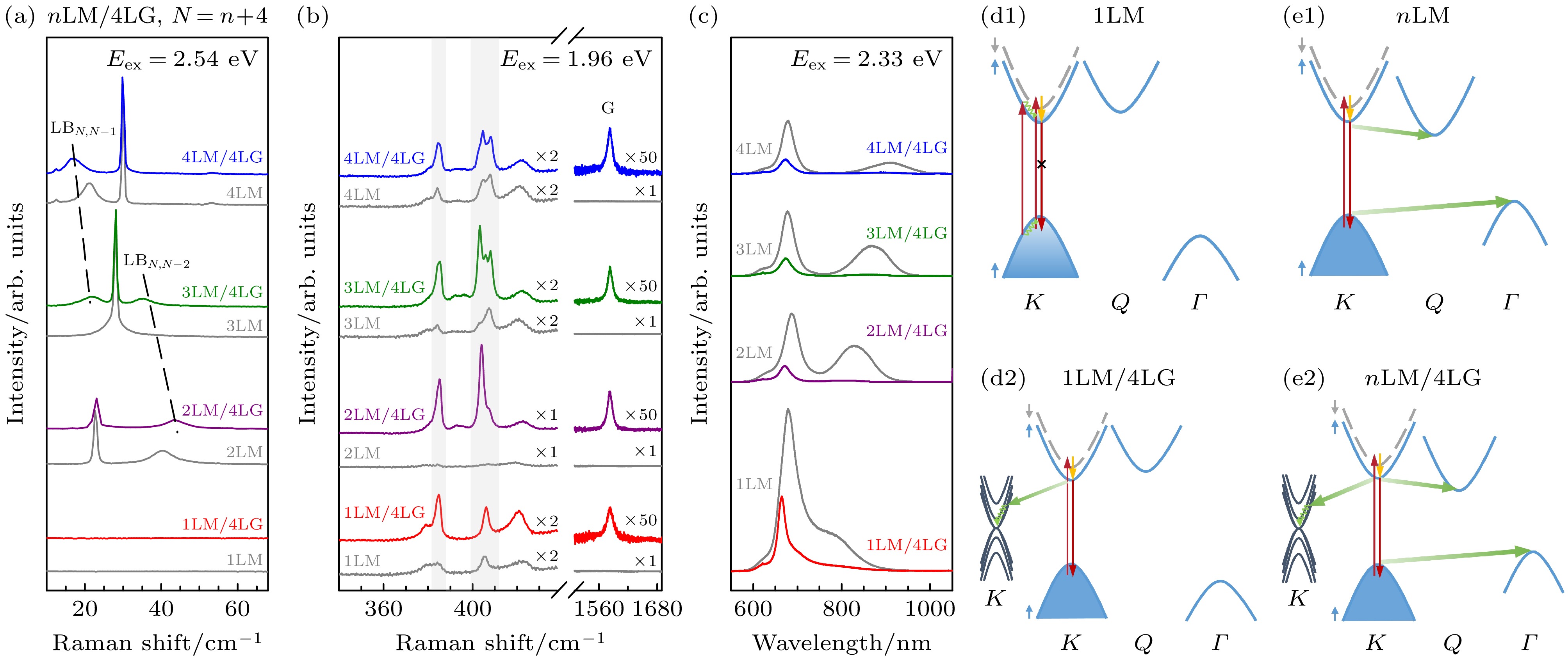 Fig. 2. Interlayer coupling and Raman enhancement mechanism in MoS2/Gr heterostructures: (a) Low-frequency modes: nLM/4LG vs. intrinsic nLM; (b) high-frequency modes: nLM/4LG vs. intrinsic nLM; (c) PL spectra: nLM/4LG vs. intrinsic nLM. Mechanism of first-order Raman enhancement: (d1), (d2) 1LM/4LG vs. intrinsic 1LM; (e1), (e2) nLM/4LG vs. intrinsic nLM, $ n \geqslant 2 $.