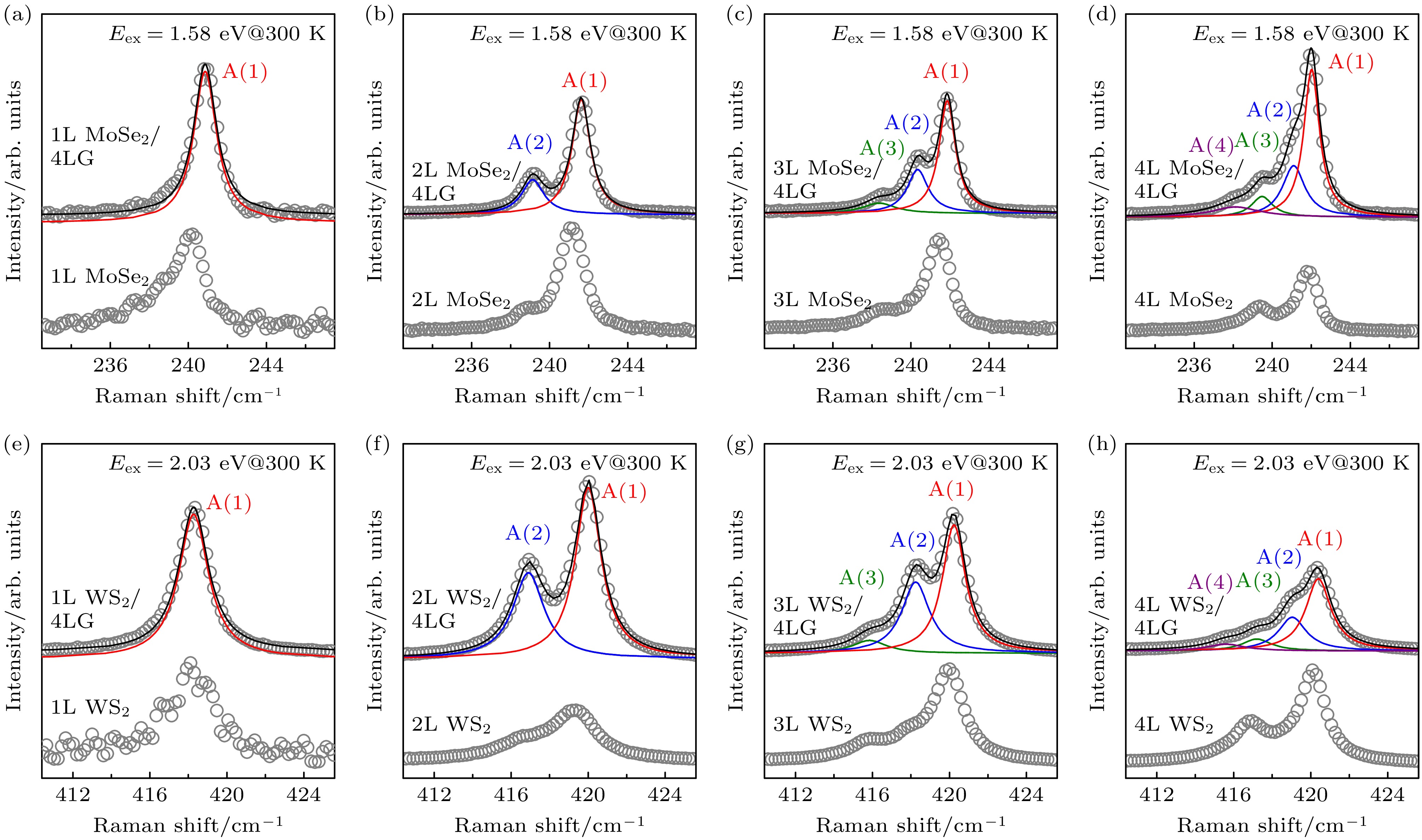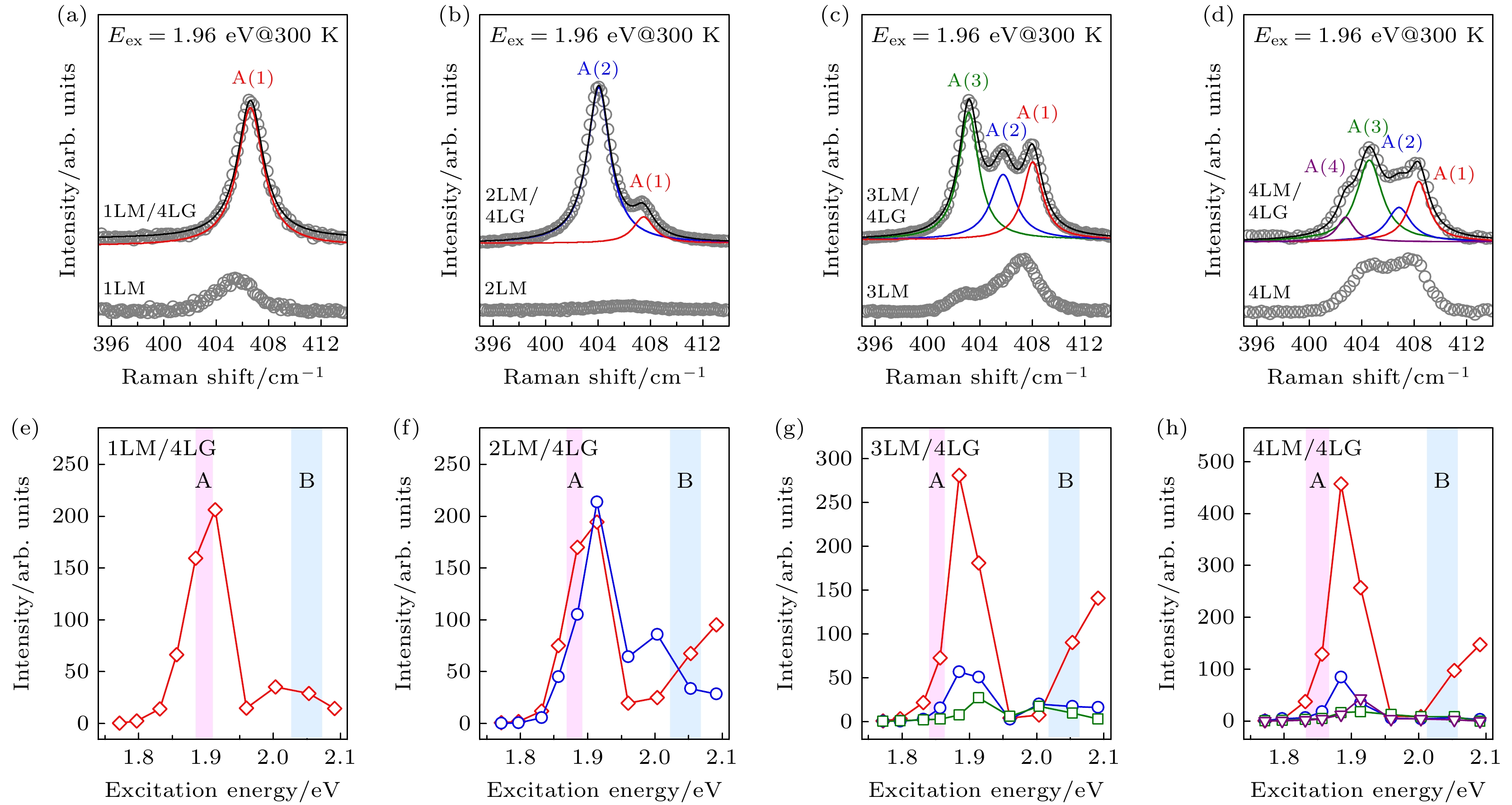 图 3 MoS2/石墨烯异质结中A模的Davydov组分 (a)—(d) 1—4LM/4LG的Davydov组分(室温); (e)—(h) 各组分峰强随激发光能量的变化(1—4LM/4LG)