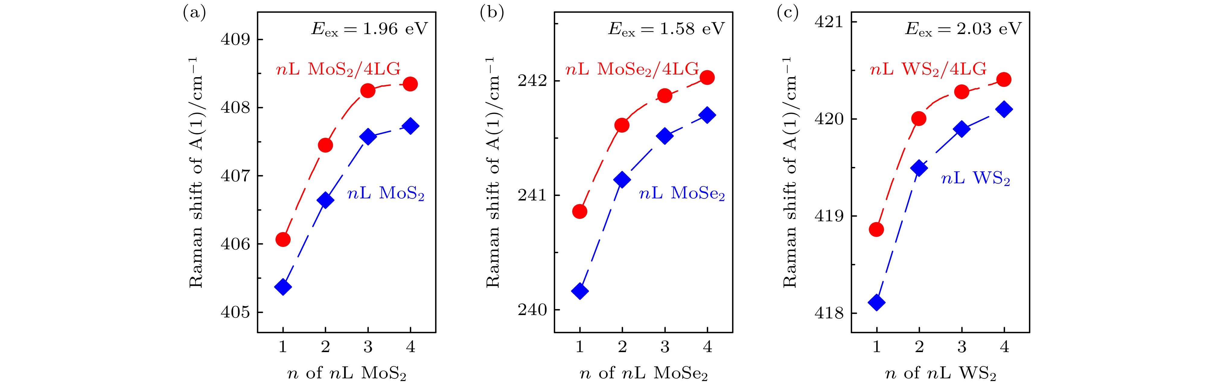 图 5 A(1)模频率的层数依赖关系 (a)—(c) 本征nL MoS2, nL MoSe2, nL WS2样品中A(1)模频率随层数的变化(蓝色菱形); nL MoS2/4LG, nL MoSe2/4LG, nL WS2/4LG异质结样品中A(1)模频率随层数的变化(红色圆形)