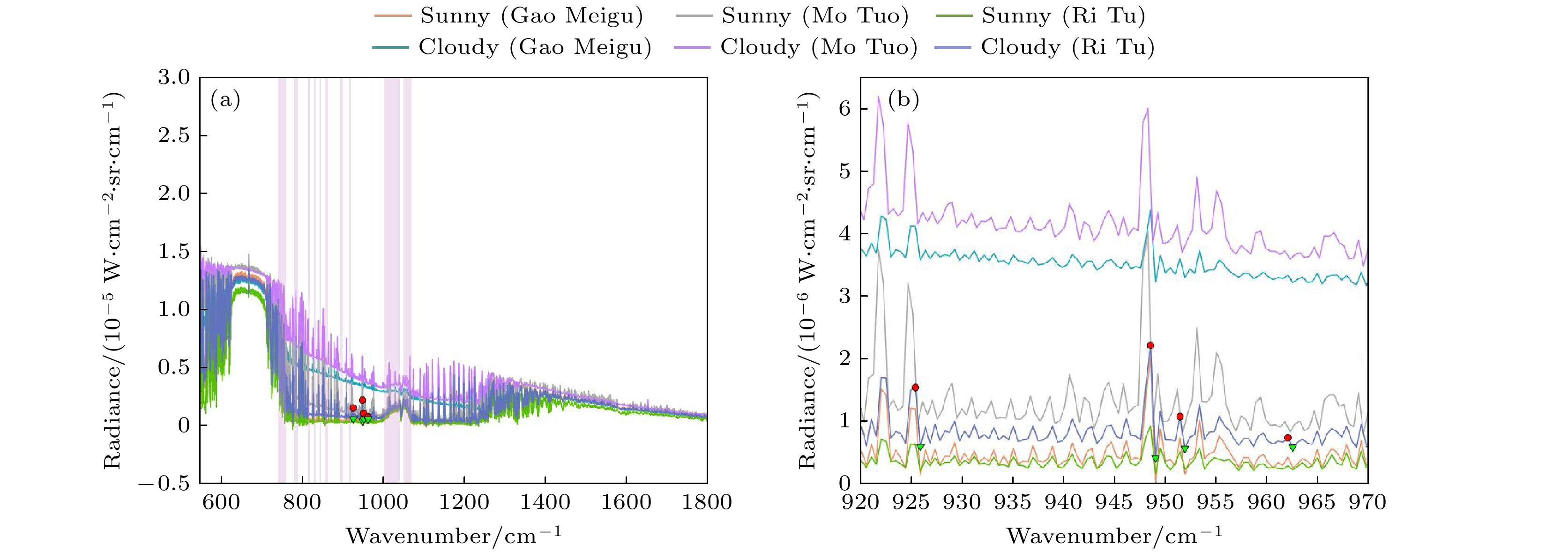 Fig. 3. The spectral characteristics of clear sky and cloudy conditions in three locations: (a) The spectral characteristics of clear sky and cloudy conditions in the 540–1800 cm–1 band; (b) a local magnified view of the newly added spectral characteristics of clear sky and cloudy conditions in the 920–970 cm–1 band.