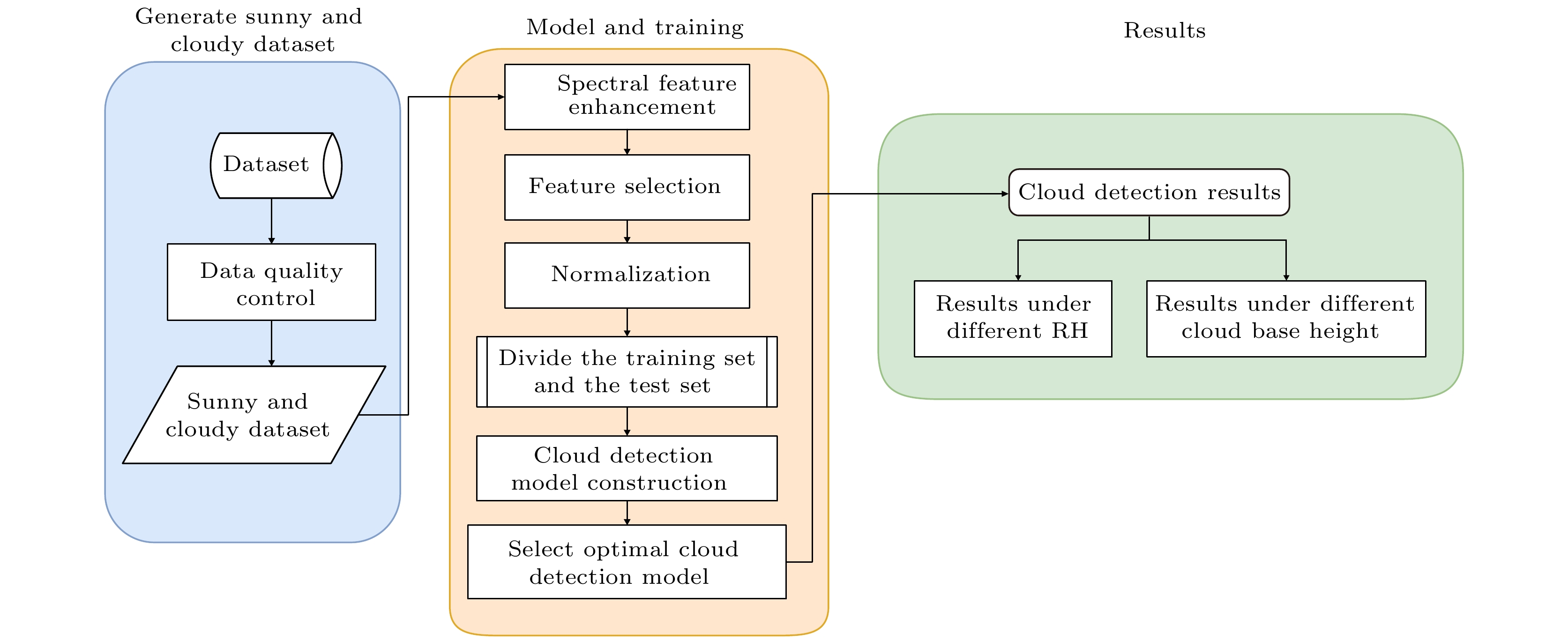 云是地基红外高光谱仪器探测大气的重要干扰源, 有效云检测不可或缺. 水汽干扰和高云识别精度低是云检测面临的两个关键挑战. 本文利用大气红外光谱探测仪(ASSIST)在云南丽江、西藏自治区墨脱和西藏自治区日土的观测数据, 分析了晴空和有云条件下的光谱特征差异, 并据此提出了一种光谱特征增强的机器学习云检测方法. 结合同步观测的激光雷达、气象站及全天空成像仪数据, 系统评估了该方法在不同相对湿度(RH)和不同云底高度(CBH)条件下的检测性能. 实验结果表明: 该方法与激光雷达检测结果的一致性高达97.61%. 在不同RH条件下, 该方法精度均优于使用原始光谱特征的方法, 尤其在RH > 70%时, 对晴空光谱的识别精度提升明显, 从86.01%提高至91.89%. 同样, 在不同CBH条件下, 新方法也展现出优于使用原始光谱特征方法的性能, 特别在识别3 km < CBH 5 km的中云和CBH > 5 km的高云时, 精度提升尤为明显. 当3 km < CBH 5 km时, 精度从95.45%提升至98.64%; 当CBH > 5 km时, 精度从87.5%提升至91.67%.Clouds exert a significant influence on infrared radiation, making cloud detection a crucial step in the application of infrared hyperspectral data. In particular, water vapor interference and the limited accuracy in high-cloud identification constitute two key challenges for ground-based infrared hyperspectral cloud detection. Traditional threshold-based cloud detection methods are difficult to adapt to different locations and dynamically changing atmospheric conditions,while machine learning methods can achieve cloud detection with higher accuracy, greater robustness, and improved automation. Building on the advantages of machine learning, observational data from the atmospheric sounder spectrometer by infrared spectral technology (ASSIST), collected at Lijiang (Yunnan), Motuo (Xizang Autonomous Region), and Ritu (Xizang Autonomous Region) in China, are used to analyze the spectral differences between sunny and cloudy conditions in this study. Based on these differences, a spectral feature enhancement-driven machine learning method for cloud detection is proposed. Finally, by incorporating synchronous observations from lidar, meteorological stations, and all-sky imagers, the proposed method is systematically evaluated under different relative humidity (RH) and cloud base height (CBH) conditions. The experimental results show that the consistency between the results obtained by the proposed method and lidar-based detection is as high as 97.61%. Under different RH conditions, the proposed method outperforms the method based on original spectral features. Notably, when ${\text{RH}} > 70{\text{%}} $, the accuracy of clear-sky spectral identification improves significantly: increasing from 86.01% to 91.89%. Similarly, under different CBH conditions, the proposed method also exhibits superior performance compared with the method in which original spectral features are used. In particular, the accuracy improvements are especially notable when identifying mid-level clouds with ${\text{3 km}} < {\text{CBH}} \leqslant 5{\text{ km}}$, as well as high-level clouds with ${\text{CBH}} > 5{\text{ km}}$. When ${\text{3 km}} < {\text{CBH}} \leqslant 5{\text{ km}}$, the accuracy increases from 95.45% to 98.64% and when ${\text{CBH}} > 5{\text{ km}}$, the accuracy improves from 87.5% to 91.67%. The proposed method significantly enhances the automation and accuracy of cloud detection, thereby providing higher-quality fundamental datasets for supporting subsequent applications such as radiative transfer simulation, remote sensing parameter retrieval, and data assimilation in numerical weather prediction (NWP) models.