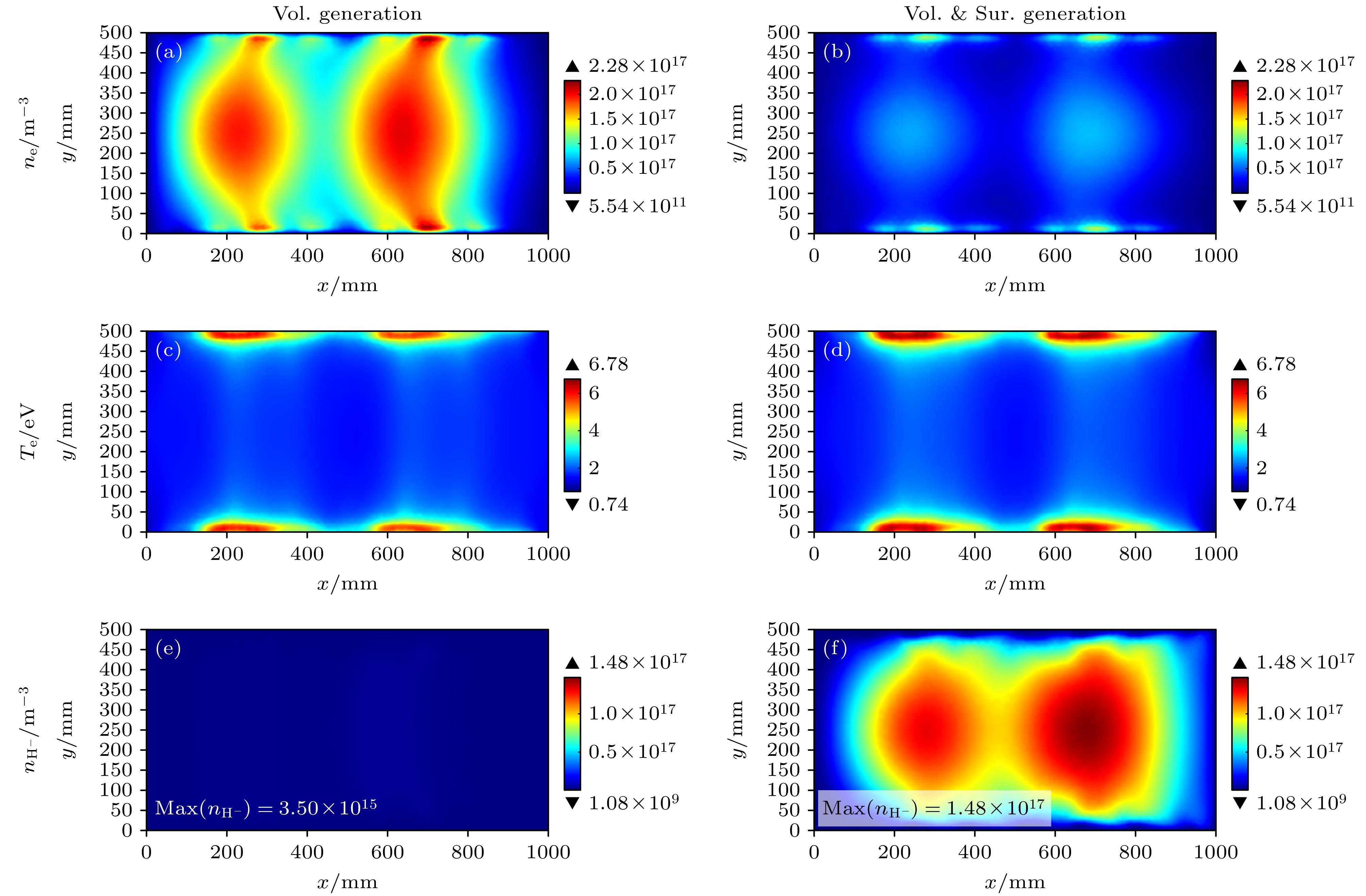 中性束注入是托卡马克装置中加热等离子体的主流辅助手段. 射频负氢离子源作为中性束注入系统的关键前端部件, 其性能直接影响中性束的质量. 目前, 提升负氢离子源性能仍是亟待深入研究的课题. 为此, 本文针对双驱动负氢离子源, 建立了一个三维流体模型, 用于模拟和优化表面产生机制下的负离子密度分布. 首先, 对比分析了体产生与表面产生两种机制下的等离子体参数, 结果表明表面产生机制获得的负离子密度比体产生机制高出1个数量级. 然而, 受过滤磁场影响, 引出区附近的负离子密度分布呈现不对称性. 为改善该不对称性, 在表面产生机制的基础上, 提出了两种优化方案: 1)在低密度侧增加射频源功率; 2)在扩散区引入隔板结构. 模拟结果显示, 两种方案均显著改善了负离子密度分布的对称性. 最后还提出了在扩散区背板添加磁屏蔽的方式来进一步优化负氢离子密度数值, 可以将扩散区下游的负离子密度提高69%.In neutral beam injection (NBI), which is a primary auxiliary heating method for tokamak plasmas, the negative hydrogen ion source (NHIS) functions as a critical front-end component governing neutral beam quality. The performance of NHIS remains a key challenge. This work presents a three-dimensional (3D) fluid model, which is developed for a double-driver NHIS to simulate and optimize surface-generated negative hydrogen ion density. A comparison of plasma parameters between the NHIS with Cs and without Cs shows that surface generation yields negative ion density one order of magnitude higher than volume generation. However, the presence of the magnetic filter field induces asymmetry in negative ion density within the extraction region. To improve this asymmetry, two approaches are proposed: 1) increasing the power of one of the drivers and 2) adding a spacer plate to the expansion region. After increasing the power of Driver I from 50 to 56 kW, the H– density asymmetry at the y = 25 cm intercept on the xy-plane (z = –22 cm) decreases from 0.04 to 0.01, and the value of H– density increases. Following the addition of a spacer plate, the H– density asymmetry further decreases to 0.004, but the value of H– density also shows a significant reduction. Finally, adding a magnetic shield to the back plate of the expansion region further optimizes H– density from 1.48×1017 m–3 to 2.50×1017 m–3, yielding a 69% increase downstream. This is because increased plasma transport into the expansion region enhances the dissociation rate of H2 molecules, thereby yielding more H atoms. The attenuation of the magnetic filter field in the driver region after adding a magnetic shield also enhances the symmetry of the H– density.