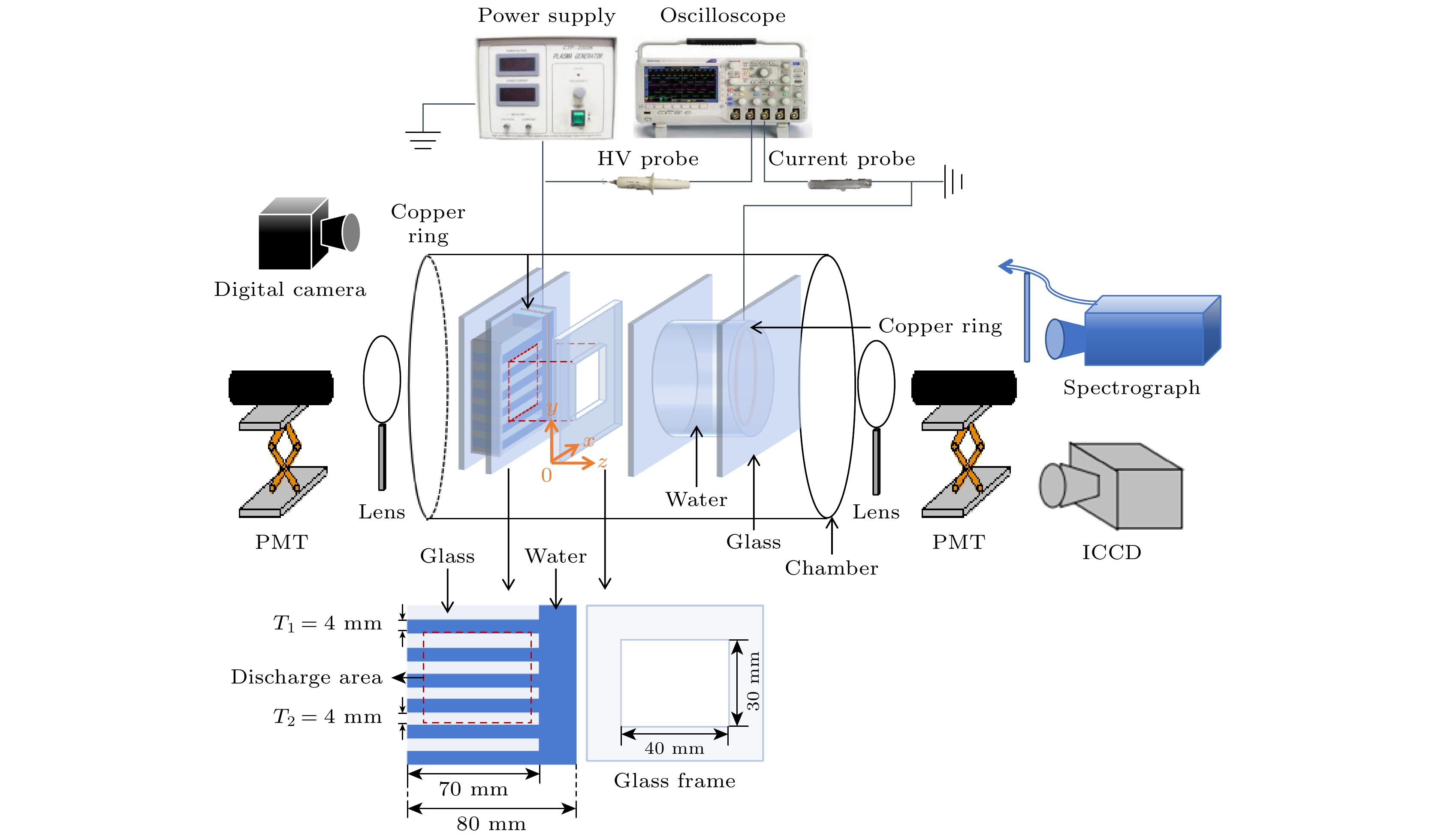 图 1 实验装置图, 其中T1区域为凹槽有水位置, T2区域为无水位置, 白色虚线框标出了完全条纹水电极表面的放电区域, 放电区域长40 mm, 宽30 mm, 气隙d = 2 mm