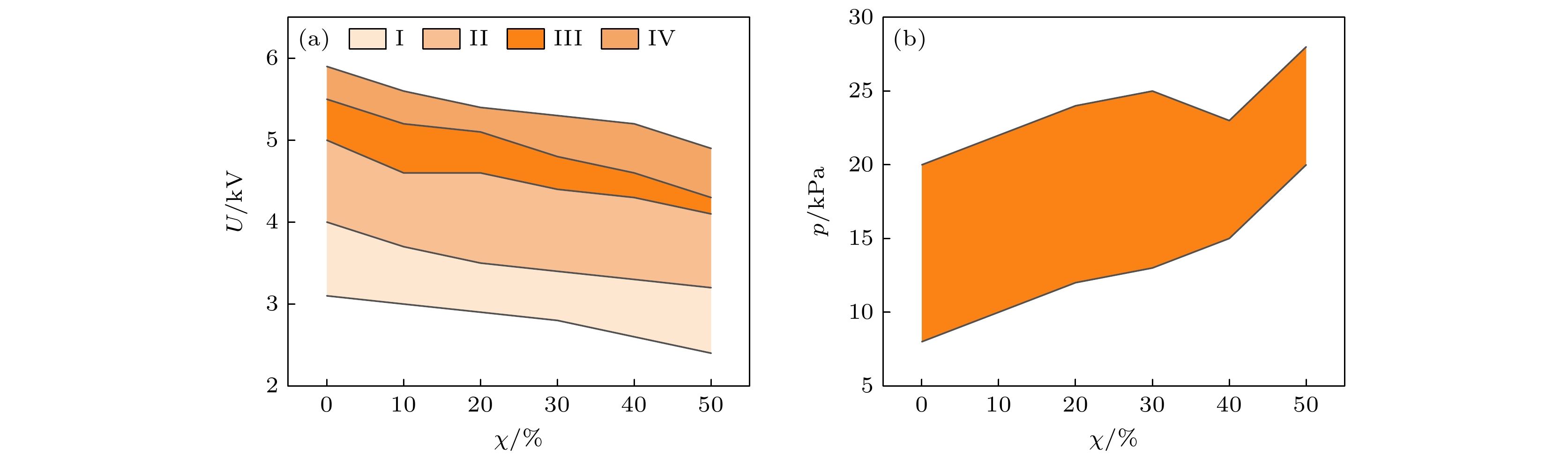 图 6 (a) 大小点蜂窝条纹超点阵斑图演化过程随电压 U 与氩气含量 χ 的相图; (b) 大小点蜂窝条纹超点阵斑图随气压 p 与氩气含量 χ 的相图