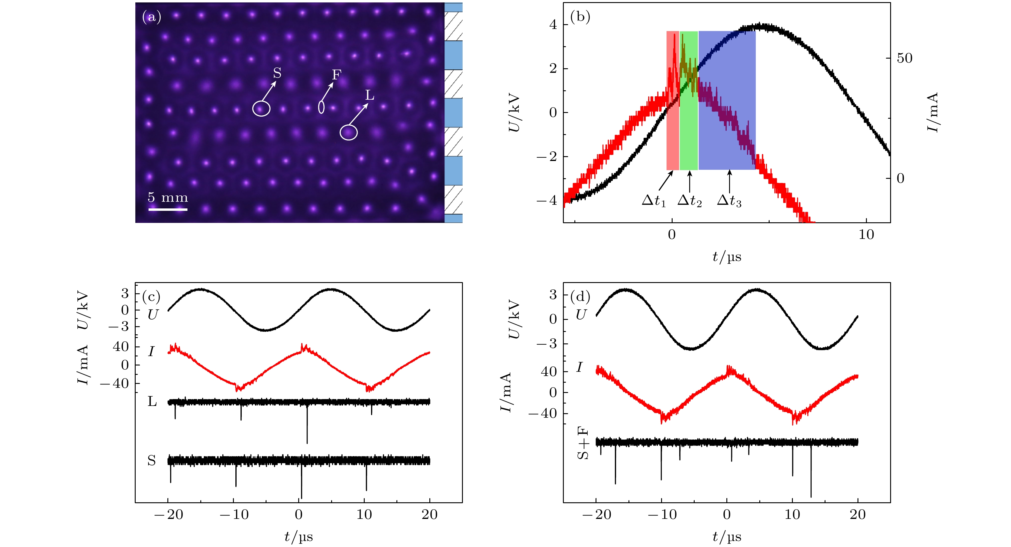 Fig. 8. Spatial-temporal structure dynamics measurement of large and small honeycomb stripe superlattice pattern: (a) Image of the pattern; (b) waveforms of voltage and current of the pattern in the positive half-cycle; (c) temporal correlation measurement of S and L; (d) temporal correlation measurement of S and F.