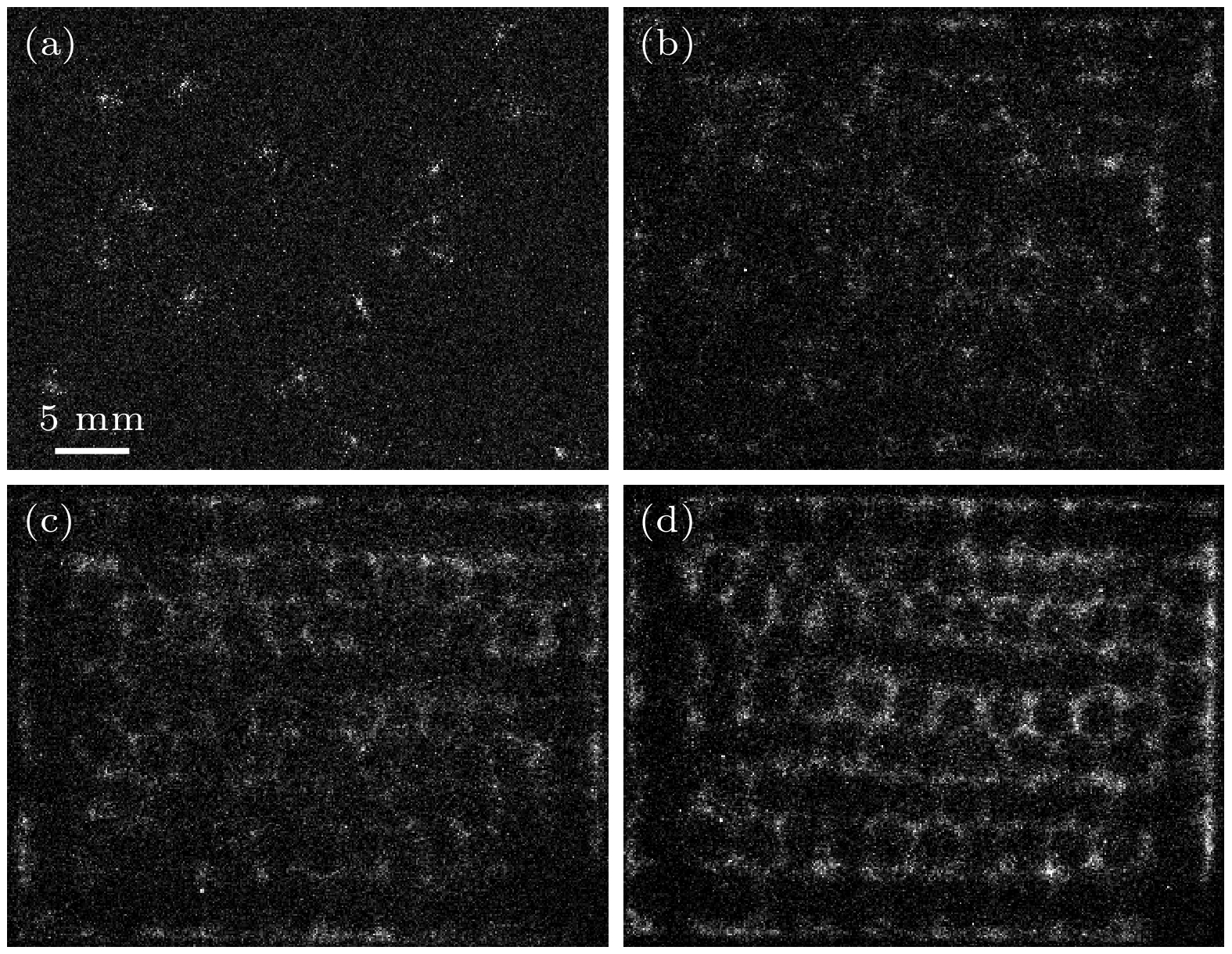 图 4 斑图类型随外加电压增加的演化过程 (a) 初始斑图, U = 2.8 kV; (b) 双条纹斑图, U = 3.4 kV; (c) 大小点蜂窝条纹超点阵斑图, U = 4.4 kV; (d) 条纹蜂窝超点阵斑图, U = 4.8 kV, 其他实验参数 p = 20 kPa, χ = 30%