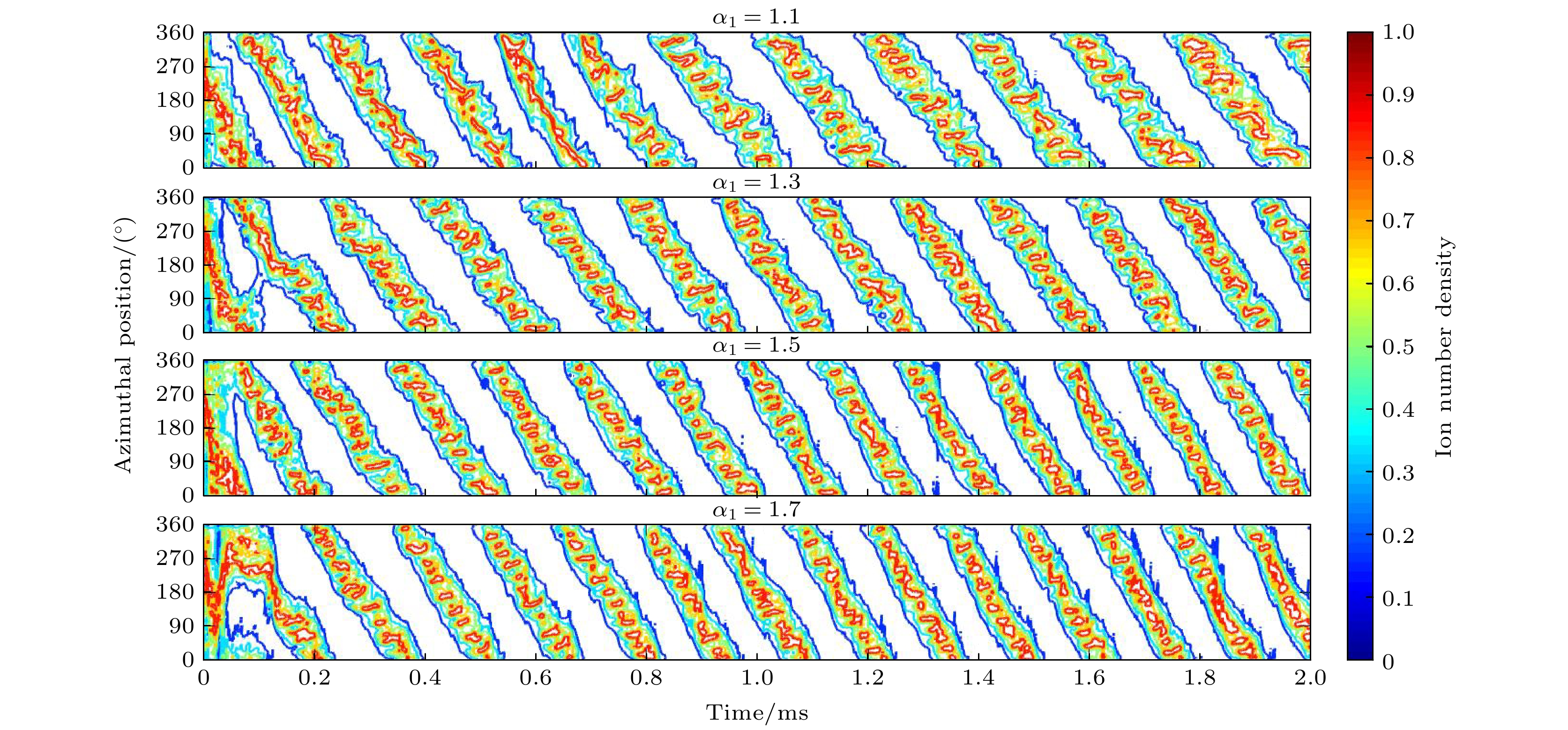 旋转辐条作为一种低频、长波长不稳定性, 广泛存在于磁控管、霍尔推力器等${\boldsymbol{E}} \times {\boldsymbol{B}}$放电装置中. 霍尔推力器中旋转辐条表现为位于放电通道中的明亮发光区域沿着角向旋转. 旋转辐条不稳定性引起的空间电势扭曲, 提高了在${\boldsymbol{E}} \times {\boldsymbol{B}}$作用下沿电势等势线漂移运动的电子到达阳极的概率, 增加了电子的轴向输运. 本文利用轴向-角向的二维粒子-流体混合模型研究了霍尔推力器放电通道中的轴向磁场梯度对旋转辐条不稳定性的影响. 采用包含等离子体密度梯度和磁场梯度效应的色散关系, 结合模拟得到的离子密度分布、电势分布、电场分布对模拟结果进行分析. 模拟结果表明, 随着放电通道内磁场梯度的减小, 模数$m = 1$的旋转辐条不稳定性的频率和传播速度会轻微的增大, 但不会对旋转辐条的传播方向和本质特征产生影响. 结合色散关系的分析结果表明, 密度梯度和磁场梯度共同驱动的角向漂移不稳定性是旋转辐条的诱发因素. 磁场改变引起的离子密度分布的变化对诱发旋转辐条的角向漂移不稳定性出现的轴向位置有轻微的影响, 但始终位于推力器出口下游附近. 结果表明旋转辐条不稳定性不属于电离不稳定性, 且改变放电通道内的磁场分布不会对旋转辐条的传播方向和模数产生影响. 本研究结果为明确旋转辐条的激发机制及其影响因素提供了理论支撑.Rotating spokes, as one of the low-frequency, long-wavelength instabilities, are commonly observed in the ${\boldsymbol{E}} \times {\boldsymbol{B}}$ plasma discharge devices, such as the magnetrons and Hall thrusters. In Hall thrusters, the rotating spokes, which are located in the discharge channel and rotate in the azimuthal direction, feature the bright luminous regions. The space potential will be distorted by the instability of rotating spokes, thereby increasing the possibility for electrons to reach the anode and enhancing their drift along the equipotential lines. However, the excitation mechanism of the rotating spoke and its influencing factors remain ambiguous. In order to address this problem, we conduct numerical simulations and linear stability analysis to investigate the effects of the magnetic field gradient on the driving mechanism and mode characteristics of the rotating spoke instability. In this work, a particle-fluid two-dimensional hybrid model in the axial-azimuthal plane is employed to numerically study the effect of axial magnetic field gradient in the discharge channel on the rotating spoke. The numerical simulation results are analyzed using a dispersion relation derived from fluid theory, which combines the effects of plasma density and the magnetic field gradient. The output profiles of ion density, potential, and electric field from the numerical simulation serve as input parameters for the dispersion relation used in the linear stability analysis. The simulation results show that the frequency and propagation velocity of the $m = 1$ rotating spoke slightly increase as the magnetic field gradient in the discharge channel decreases. However, changing the magnetic field gradient in the discharge channel does not affect the propagation direction nor intrinsic characteristics of the rotating spoke. More specifically, when the value of ${\alpha _1}$increases from 1.1 to 1.7, which means a decrease of the magnetic field gradient in the discharge channel, the mode frequency rises from 6.2 kHz to 7.5 kHz, remaining within the frequency range of the rotating spoke instability. At the same time, the phase velocity also increases form 1013 m/s to 1225 m/s, which is consistent with the propagation velocity of the rotating spoke instability, and the rotating spoke instability still propagates along the ${\boldsymbol{E}} \times {\boldsymbol{B}}$ direction. Dispersion relation analysis indicates that the rotating spoke arises from an azimuthal drift instability which is located near downstream region of the thruster exit, and it is excited by the plasma density and magnetic field gradient effects. The axial position of the azimuthal drift instability, responsible for the rotating spoke formation, is slightly modulated by density profile variations caused by the change of magnetic field in the discharge channel. However, it remains near the downstream region of the thruster exit. The results indicate that the rotating spoke does not originate from ionization instabilities, and changing the magnetic field distribution in the discharge channel does not affect its propagation direction nor mode number. The research results provide theoretical support for explaining the excitation mechanism and key influencing factors of rotating spoke.