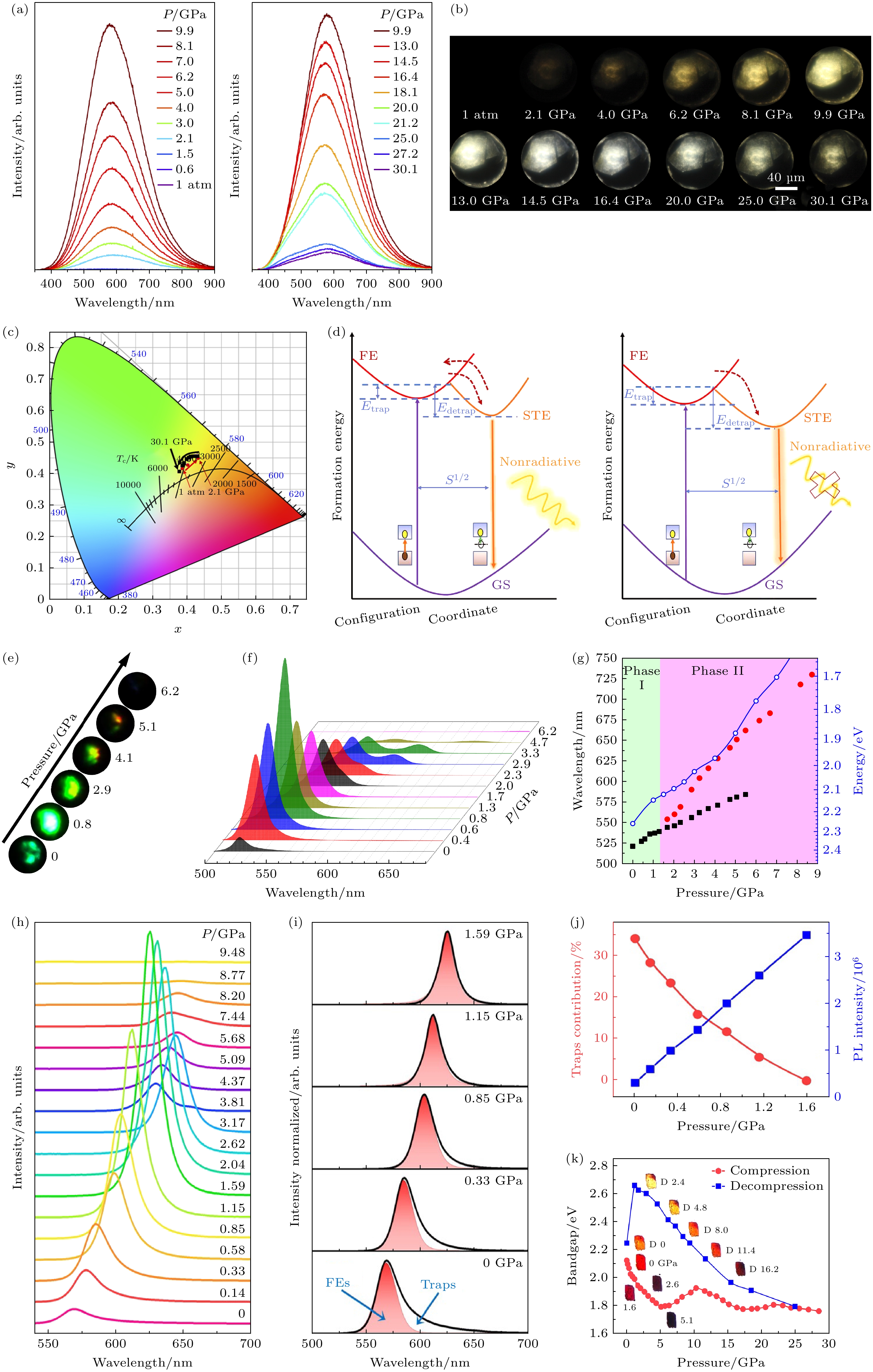 Fig. 10. (a)–(c) PL measurements of (2meptH2)PbCl4 at high pressure: (a) Pressure-induced evolution of emission spectra of (2meptH2)PbCl4 upon compression; (b) optical images at selected pressures under UV irradiation of 355 nm; (c) chromaticity coordinates of the emissions as a function of pressure. (d) illustration of the evolution of self-trapped exciton emission of the (2 meptH2)PbCl4 crystal at ambient conditions and 5.0 GPa[60]. (e)–(g) PL measurements of (CMA)2PbI4 at high pressure: (e) Optical image of the sample chamber at selected pressures with a 360 nm UV laser as the excitation source; (f) PL spectra excited by a 360 nm UV laser upon compression at selected pressures; (g) pressure dependence of PL peak positions compared with DFT computed bandgap energies as reference[68]. (h)–(k) in situ optical properties of (HA)2(GA)Pb2I7 single crystals under high pressures: (h) PL spectra excited by 405 nm laser during compression; (i) the fitting curves of the PL spectra under selected pressures; (j) contribution of trapped states emission and the PL intensity as a function of pressure; (k) bandgap evolution as a function of pressure and the corresponding optical images[69].