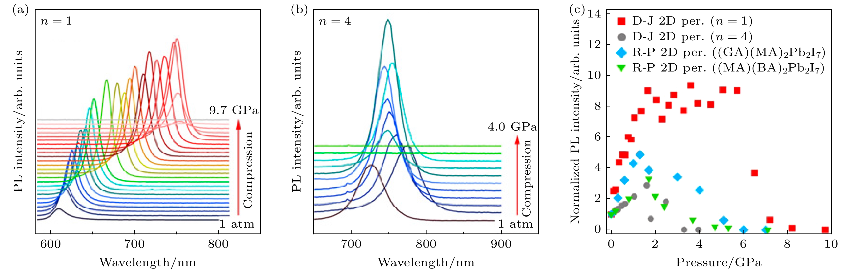 Fig. 11. (a) PL spectra of (3AMP)PbI4 (n = 1) from 1 atm to 9.7 GPa; (b) PL spectra of (3AMP)(MA)3Pb4I13 (n = 4) from 1 atm to 4.0 GPa; (c) summary of normalized PL peak intensities of D-J perovskites (3AMP)PbI4 and (3AMP)(MA)3Pb4I13, alternating-cation R-P perovskite (GA)(MA)2Pb2I7 and R-P perovskite (MA)(BA)2Pb2I7[56].