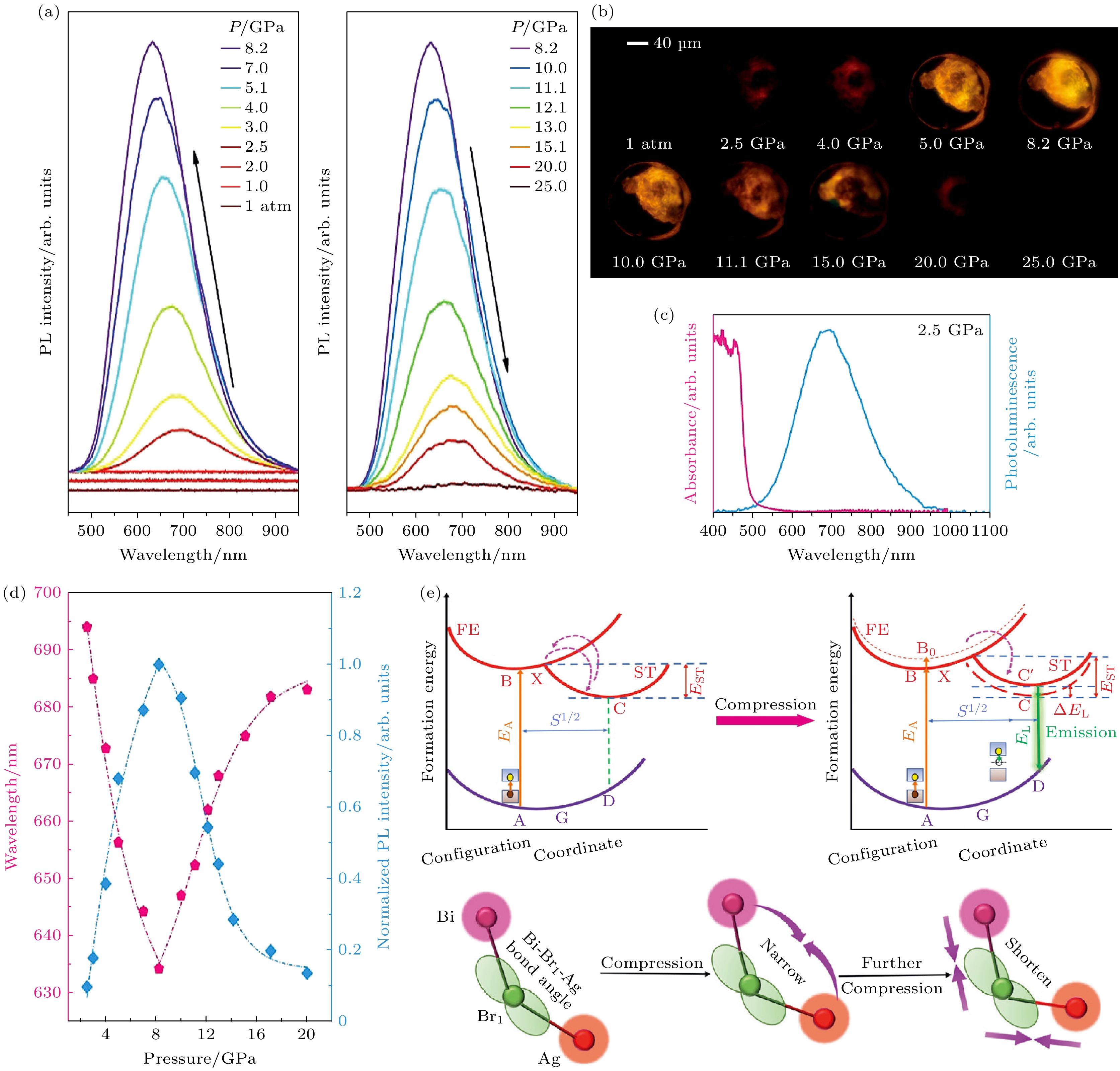 图 12 (a) (BA)4AgBiBr8在高压下的PL光谱; (b) (BA)4AgBiBr8光致发光显微照片随压力增大的变化图像; (c) 2.5 GPa下(BA)4AgBiBr8的吸收和发射图谱; (d) (BA)4AgBiBr8的PL峰位和归一化 PL 强度作为压力的函数; (e) 在环境条件(左)下和压缩时(右)与自陷激子相关的发射机制图示[74]