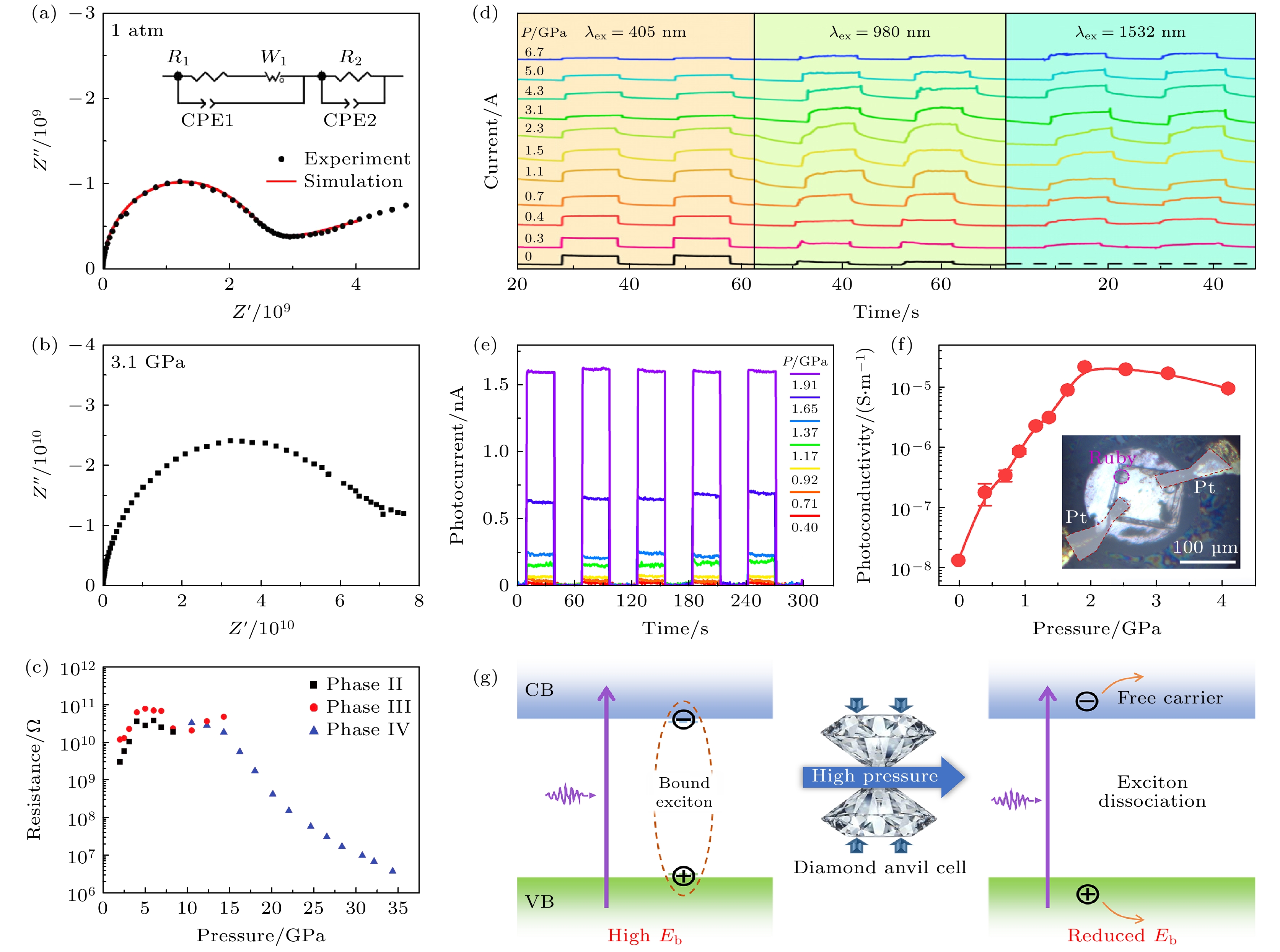 Fig. 13. Impedance data of (BA)2PbI4 at ambient conditions (a) and 3.1 GPa (b)[52]; (c) pressure dependence of the resistance of (BA)2PbI4; (d) the I-T curves of (BA)2(FA)Sn2I7 samples under different pressures under 405, 980, and 1532 nm laser irradiation[80]; (e) photocurrents upon compression of Cs2PbI2Cl2 in phase I; (f) pressure-induced evolution of photoconductivity of Cs2PbI2Cl2, the inset displays a microphotograph of the crystal with platinum probes in the DAC; (g) schematic diagram of the pressure-promoted exciton dissociation[82].