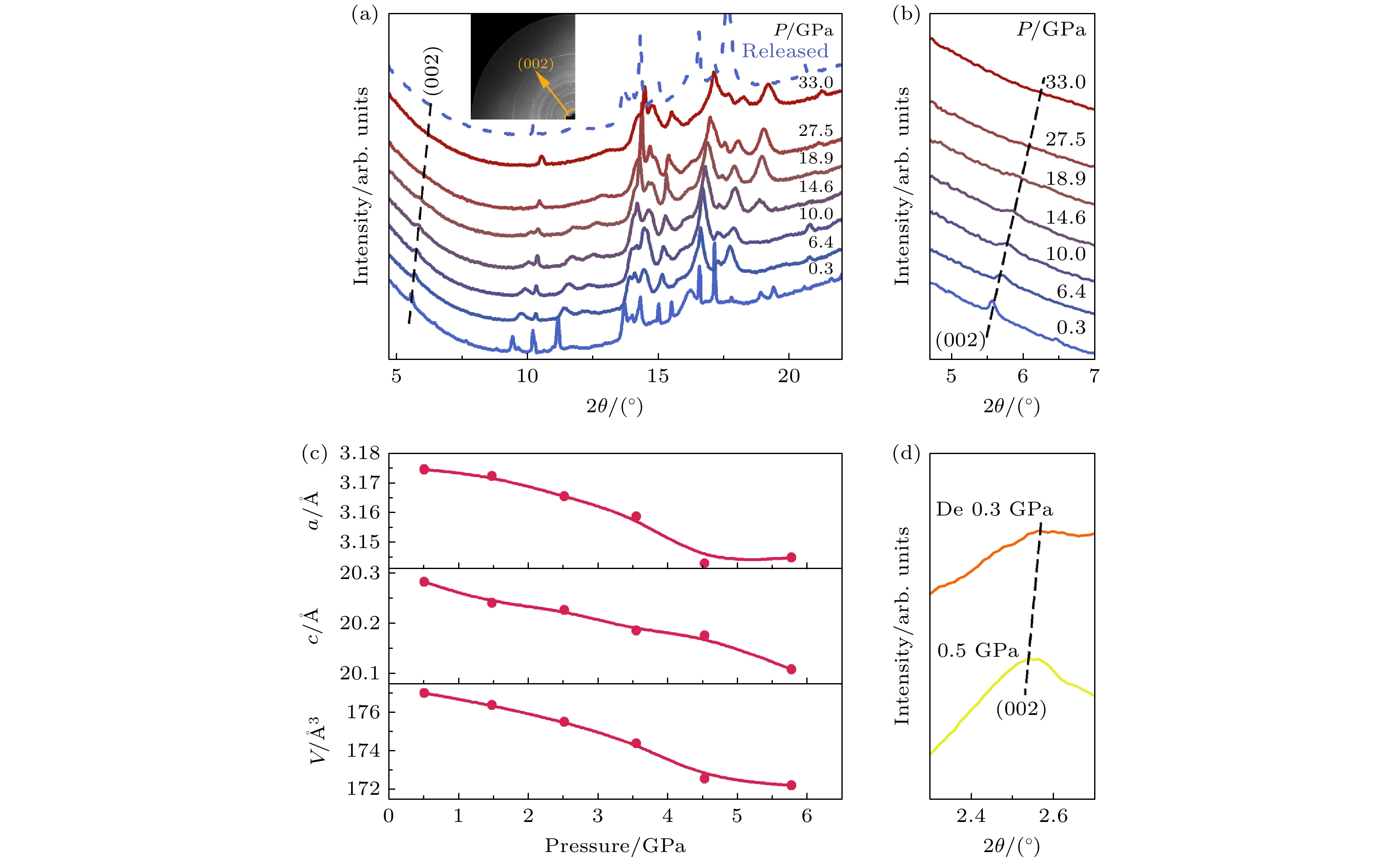 Fig. 14. (a) Representative XRPD patterns of Ti3C2Tx at selected pressures and (b) corresponding magnified (002) peak; (c) lattice parameters (a, c, and V) as functions of pressure; (d) patterns of the (002) peak at 0.5 GPa during compression and 0.3 GPa after pressure being fully released[87].