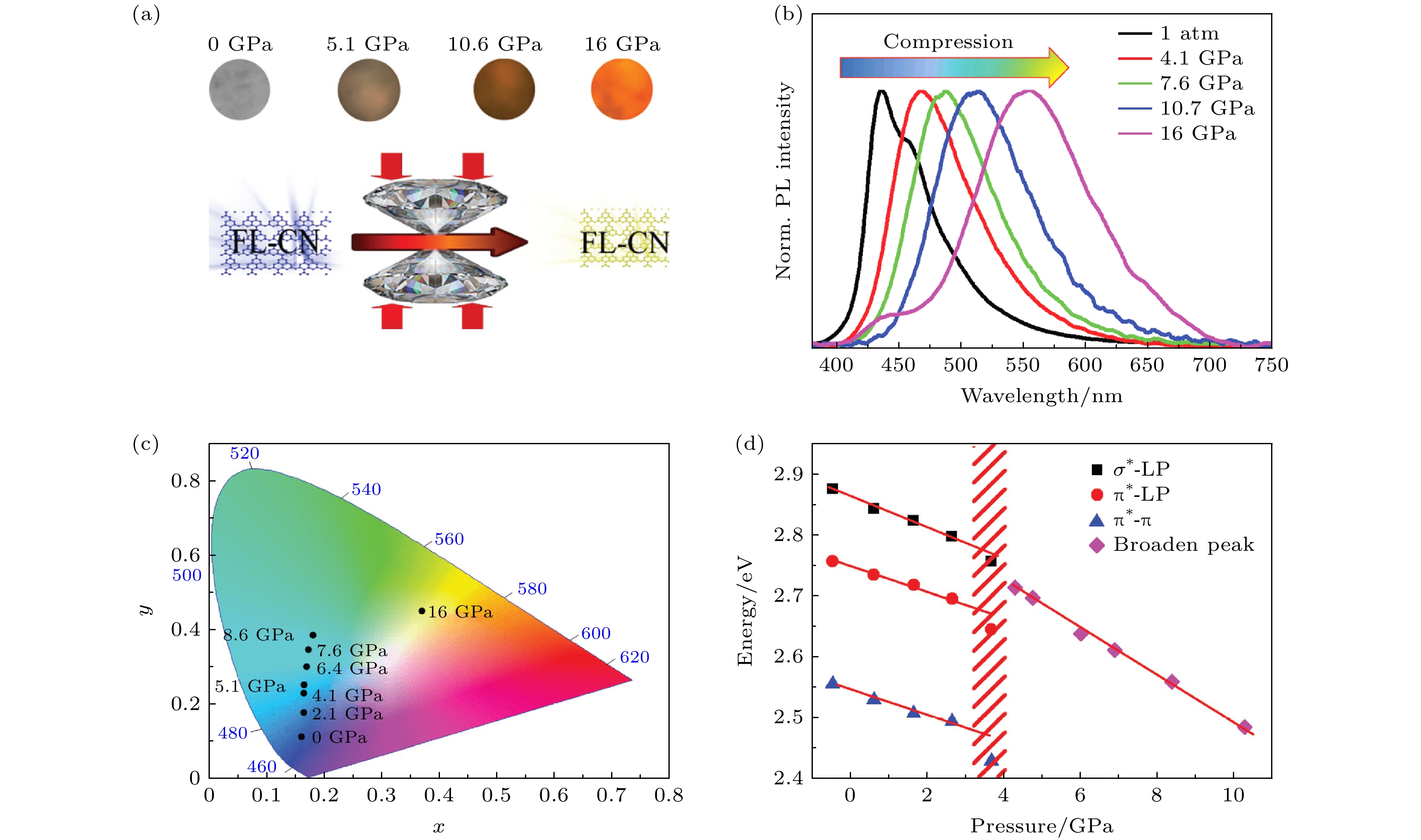 图 16 (a) FL-CN 的 PL 发射颜色和样品颜色变化的示意图; (b) 选定压力下 FL-CN 的归一化 PL 光谱; (c) 发射的压力依赖性色度坐标; (d) 选定压力下 PL 能量(在 3 GPa 后由于 PL 光谱展宽特征, 需拟合为一个峰而非3个峰)的压力依赖性[95]