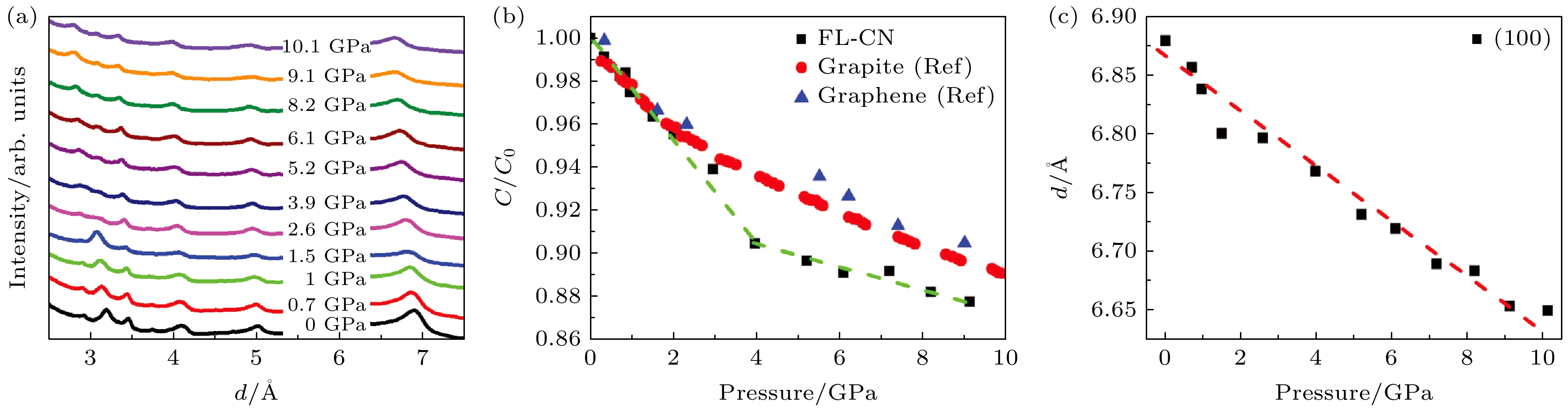 Fig. 17. (a) Representative synchrotron XRD patterns of FL-CN at different pressures; (b) the c/c0 of FL-CN, graphite, and few-layer graphene at selected pressures; (c) pressure dependence of the (100) diffraction peak[95].