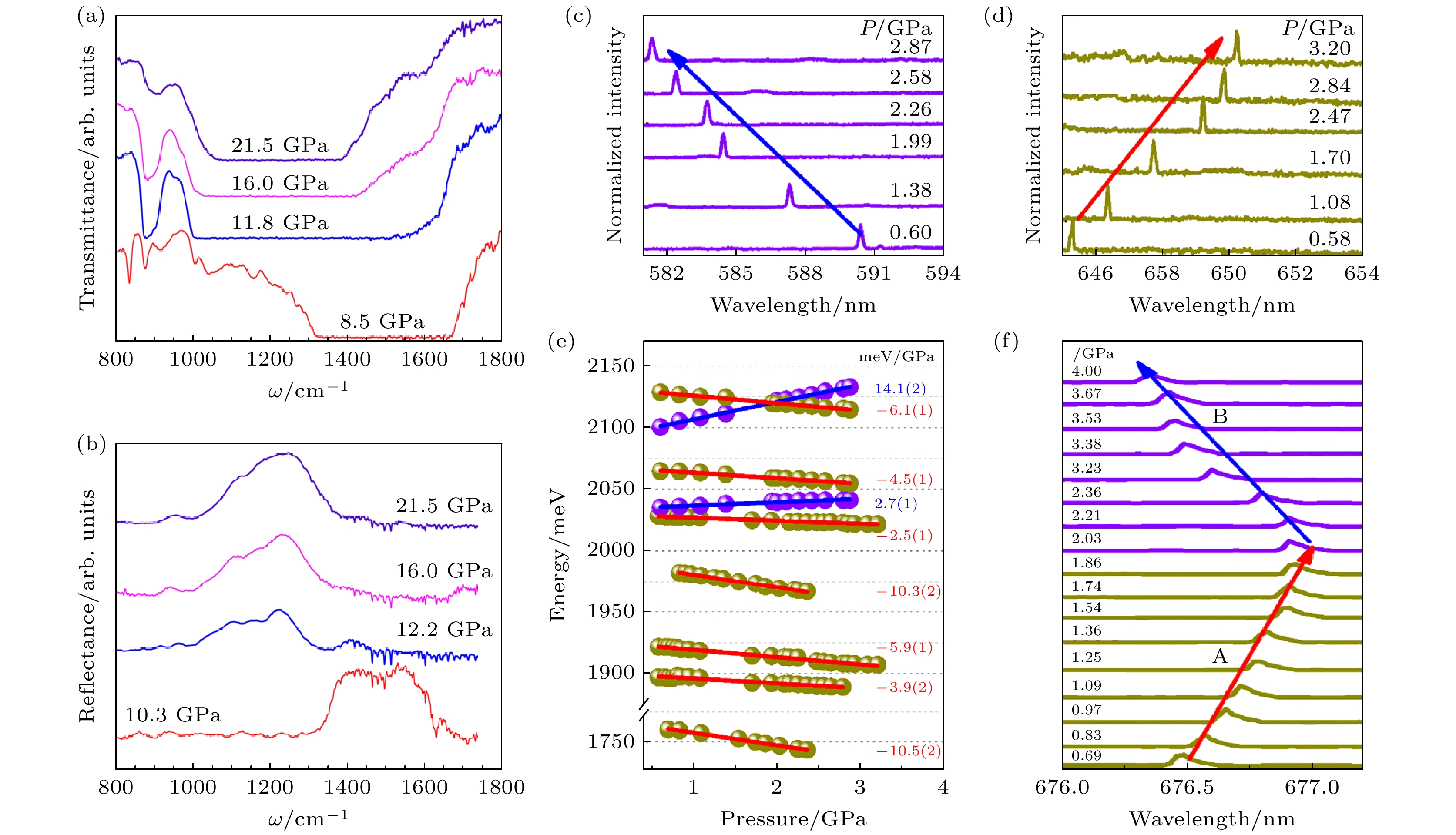 图 18 (a) 在发生 h-BN向w-BN 转变的压力范围内, 加压测量中记录的 BN 样品在几个压力下的红外透射光谱; (b) 在相变发生的压力范围内, 另一个 BN 样品在几个压力下的反射光谱[105]; (c), (d) 两条不同缺陷发射线的压力依赖性; (e) 在0.5—3.5 GPa压力范围内, 9个典型缺陷的发射线PL峰值能量随压力的函数关系, 右列中的数字代表相应的压力系数; (f) 压力系数负值绝对值低于2 meV/GPa的缺陷发射线随压力的变化[106]