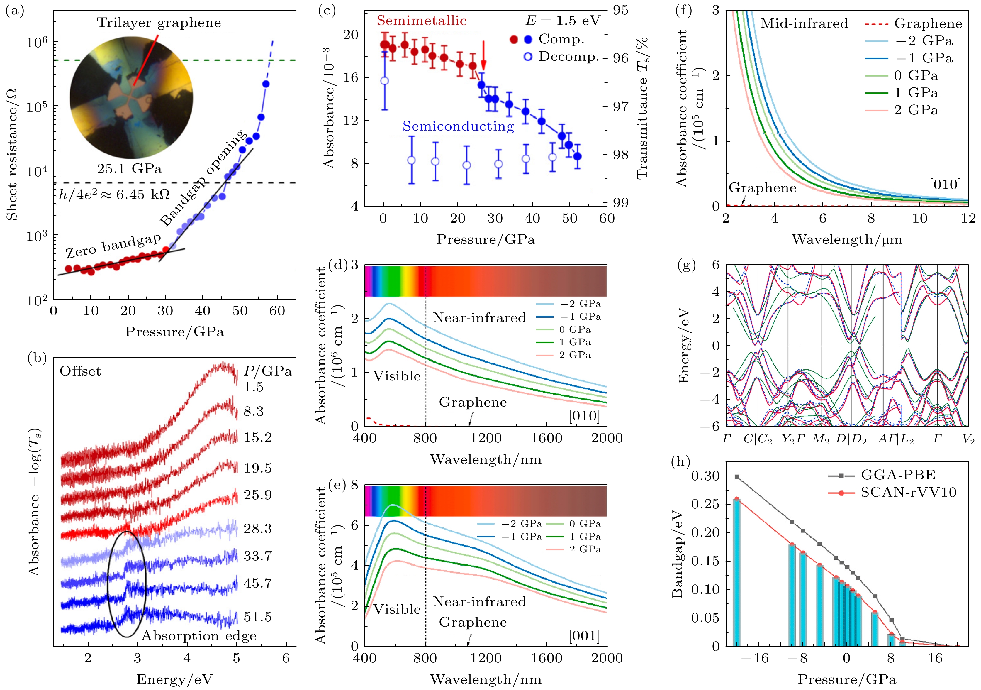 Fig. 2. (a) Resistance-pressure curves of trilayer graphene measured at room temperature. The black dashed line denotes the resistance quantum, h/4e2 ~ 6.45 kΩ, above which, a disordered conductor would behave as an insulator at low temperatures due to Anderson localization; (b) the optical absorbance patterns of trilayer graphene under compression; (c) evolution of absorbance at a photon energy of 1.5 eV during compression and decompression[16]; electromagnetic wave absorption coefficient of VC-graphene in the visible range of 400–800 nm and infrared range of 800–2000 nm along (d) [010] and (e) [001] directions; (f) the electromagnetic wave absorption coefficient along [010] direction of VC-graphene in the infrared range of 2–12 μm; (g) band structure of VC-graphene calculated; (h) bandgap engineering of graphene metamaterials under different pressures[17].
