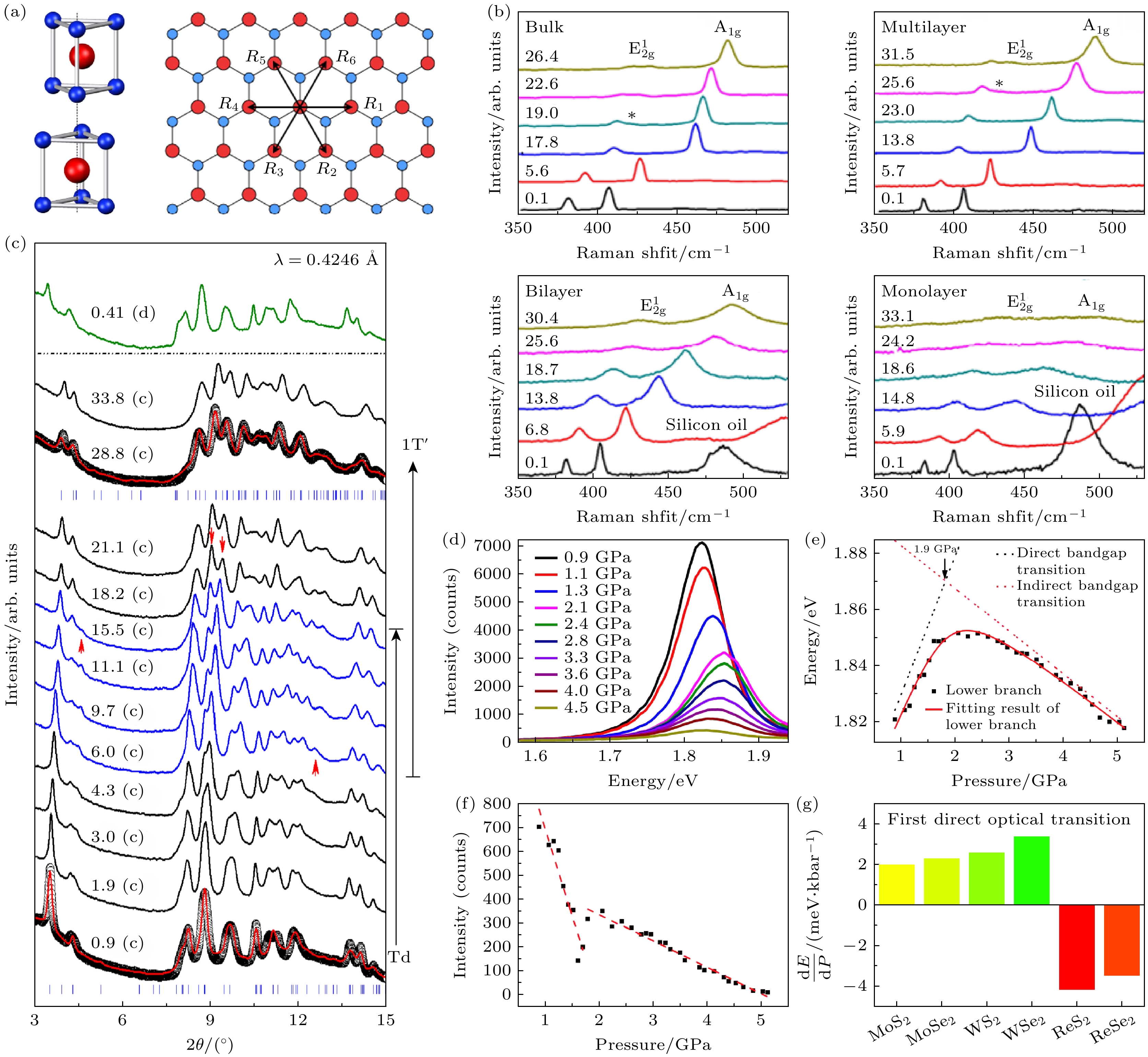 Fig. 3. (a) The unit cell of bulk MoS2 (left) top view of the MoS2 monolayer(right)[22]; (b) Raman spectra of bulk, multilayer, bilayer, and monolayer MoS2 samples under different pressures[24]; (c) synchrotron XRD patterns of WTe2 during the compression (denoted by c) and decompression (by d), numbers represent pressures in unit of GPa[31]; (d) PL spectra of monolayer MoS2 for various pressures; (e) the evolution of energy of the predominant PL peak versus pressure; (f) integrated intensities of PL peak under various pressures[34]; (g) histogram showing the pressure coefficient of the first direct optical transitions of ReX2 (X = S, Se), MoX2 and WX2 [36].