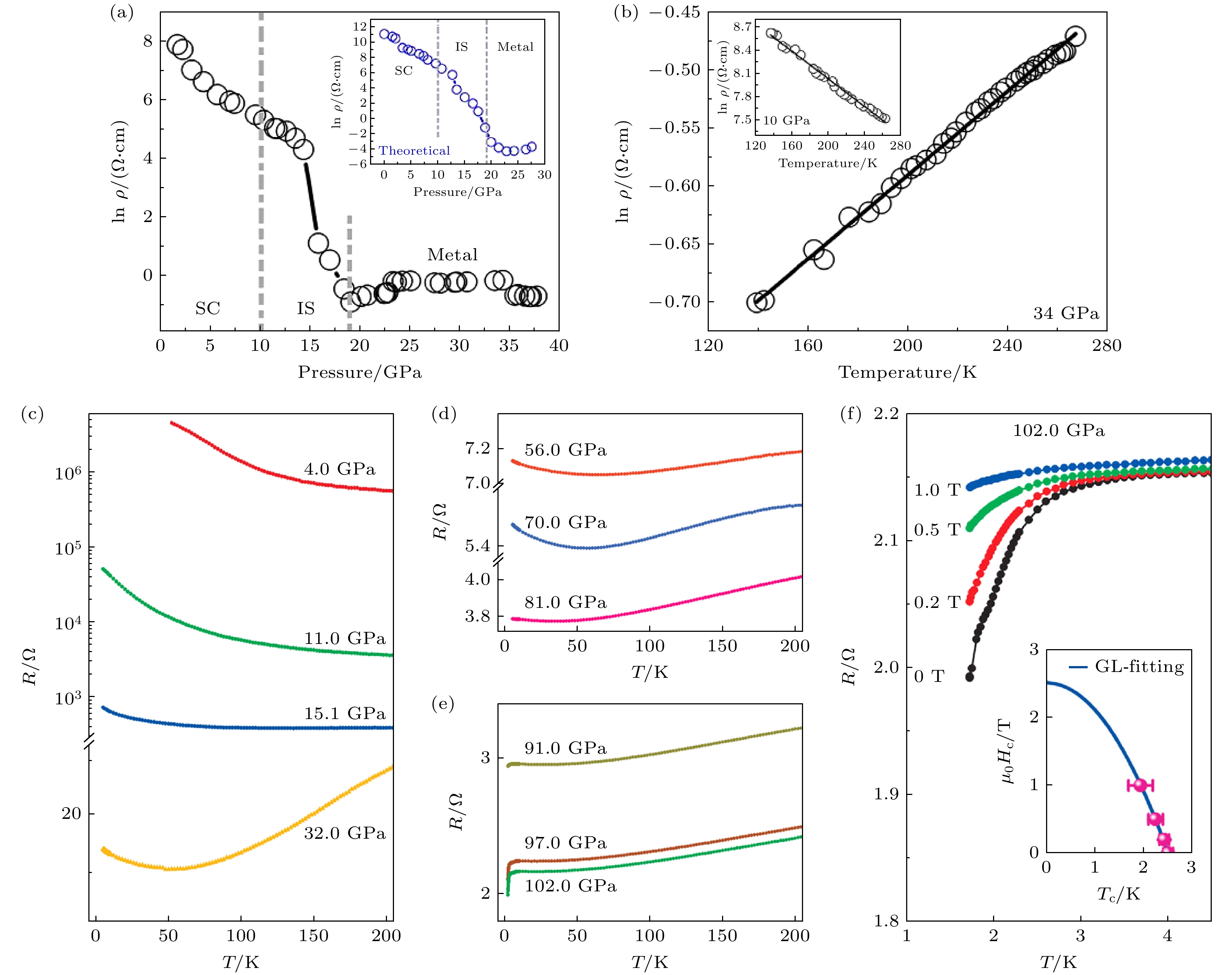 Fig. 4. (a) Pressure-dependent electrical resistivity of MoS2, three characteristic regions have been identified: semiconducting (SC), intermediate state (IS) and metallic regions. Inset: theoretically calculated pressure-dependent electrical resistivity; (b) temperature-dependent resistivity of MoS2 in the metallic state, the inset shows the experimental temperature-dependent semiconducting behavior of MoS2. The solid lines serve as visual guides[30]; (c)–(e) the temperature dependence of the in-plane electric resistance of ReS2 at different pressures; (f) magnetic field dependence of the resistance drop in ReS2 at 102.0 GPa, the inset shows the temperature dependence of the upper critical field μ0Hc2 at 102.0 GPa[32].